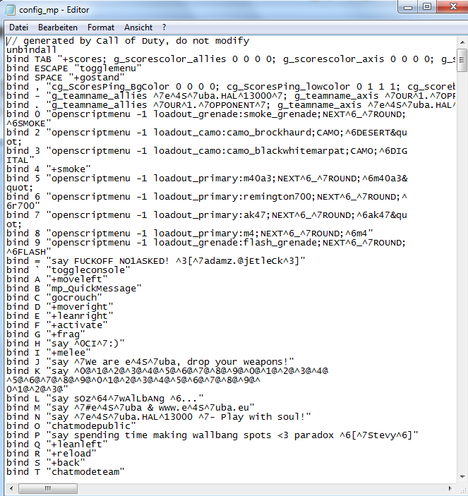 ich habe mir die paradox config heruntergeladen (sehr zu empfehlen), ich habe allerdings das Problem, das ich auf verschiedenen Tasten wie J oder K binds habe wie "we are eSuba drop your weapons" oder so. Und das kommt natürlich überhaupt nicht geil im cw oder so, wenn ich mich mal vertippe. Komischerweise finde ich in der config.mp keinen Eintrag?