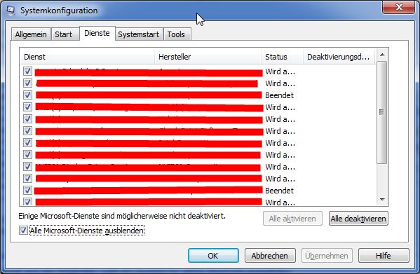 4) Im Anschluss gehe auf den Service-Tab/Dienste und aktiviere „Alle Microsoft-Dienste ausblenden“ und drücke