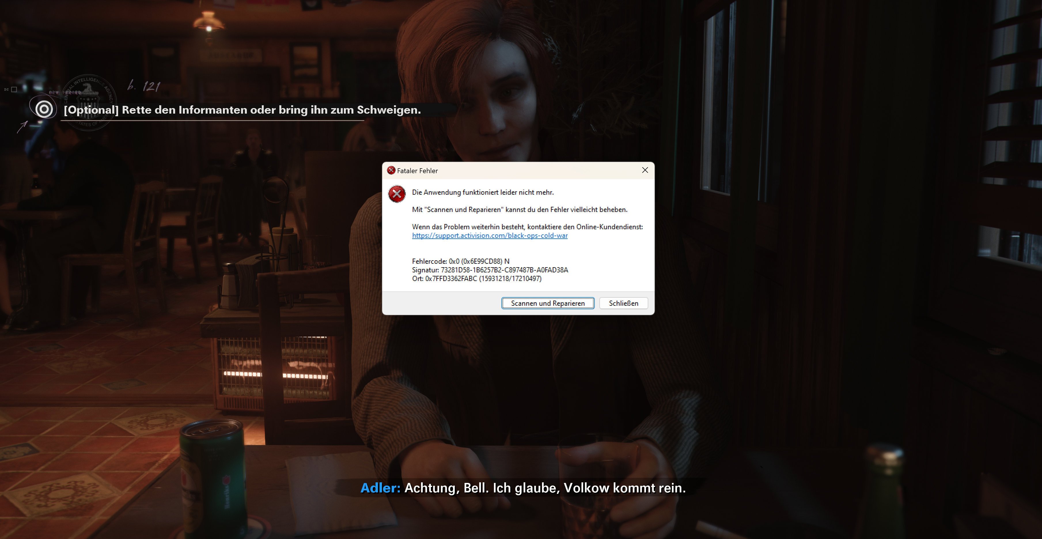 Ich arbeite gerade meinen pile of shame ab und da ist das nicht ganz taufrische Cold War nun an der Reihe. Via Battle.net gespielt, passte alles an sich (pro Mission ein Absturz, aber ein Neuladen half), bis nun hier zu der Mission in Ostberlin in der man "Volkov" in der Kneipe abfangen/treffen soll. Nach dem Gespräch mit dem Mädel am Tisch (blauer Regenschirm^^) soll er nun reinkommen und an genau dieser Stelle stürzt das Spiel immer und immer wieder ab. Fehlermeldung siehe Screenshot.