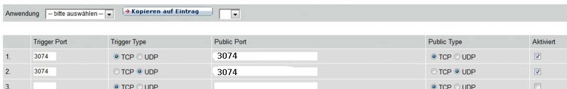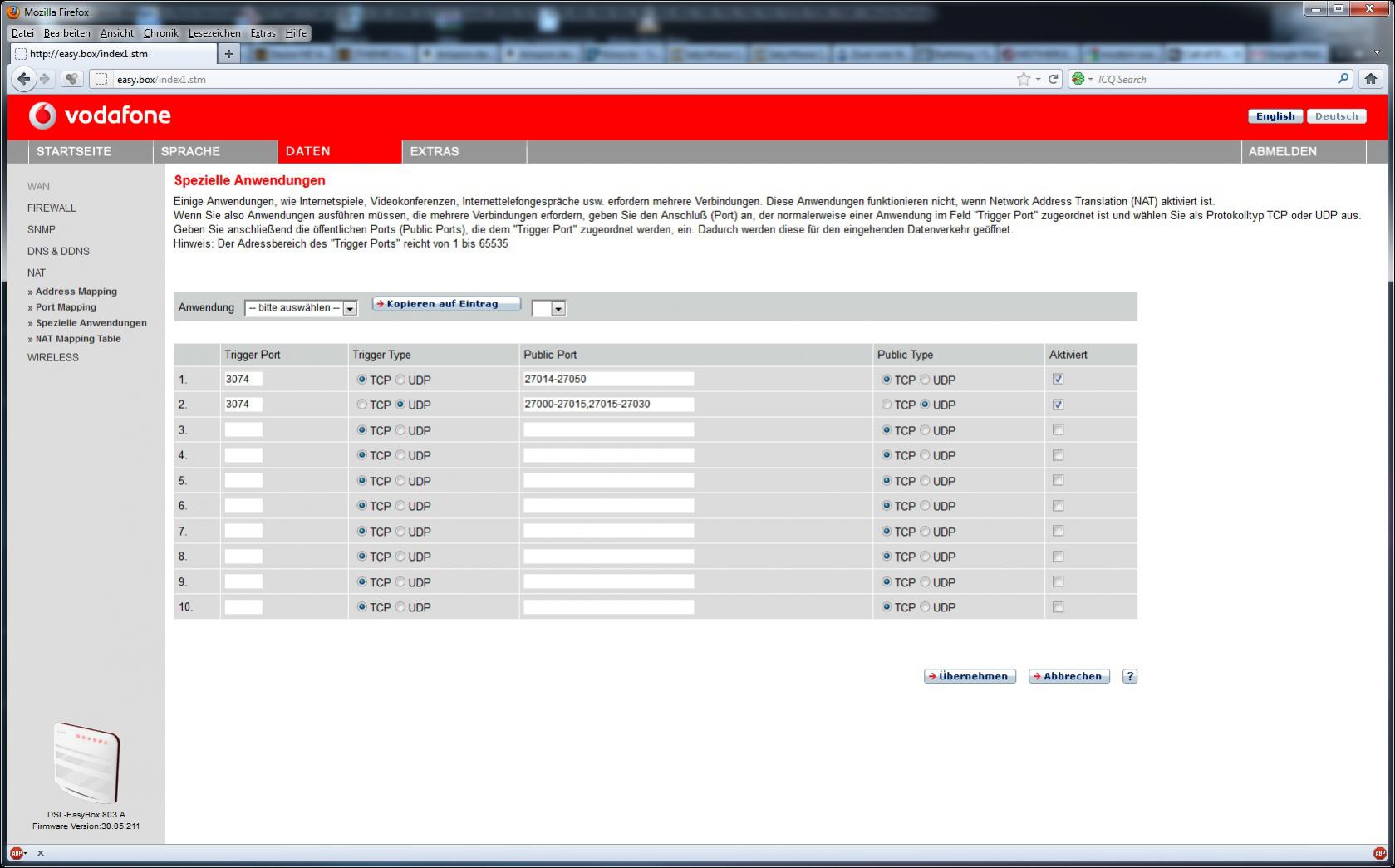 Dann im Router Menü unter “Daten” dann links auf “NAT” danach auf “Spezielle Anwendungen” habe ich die Port daten angegeben, die mir Activision per mail zugestellt hat.