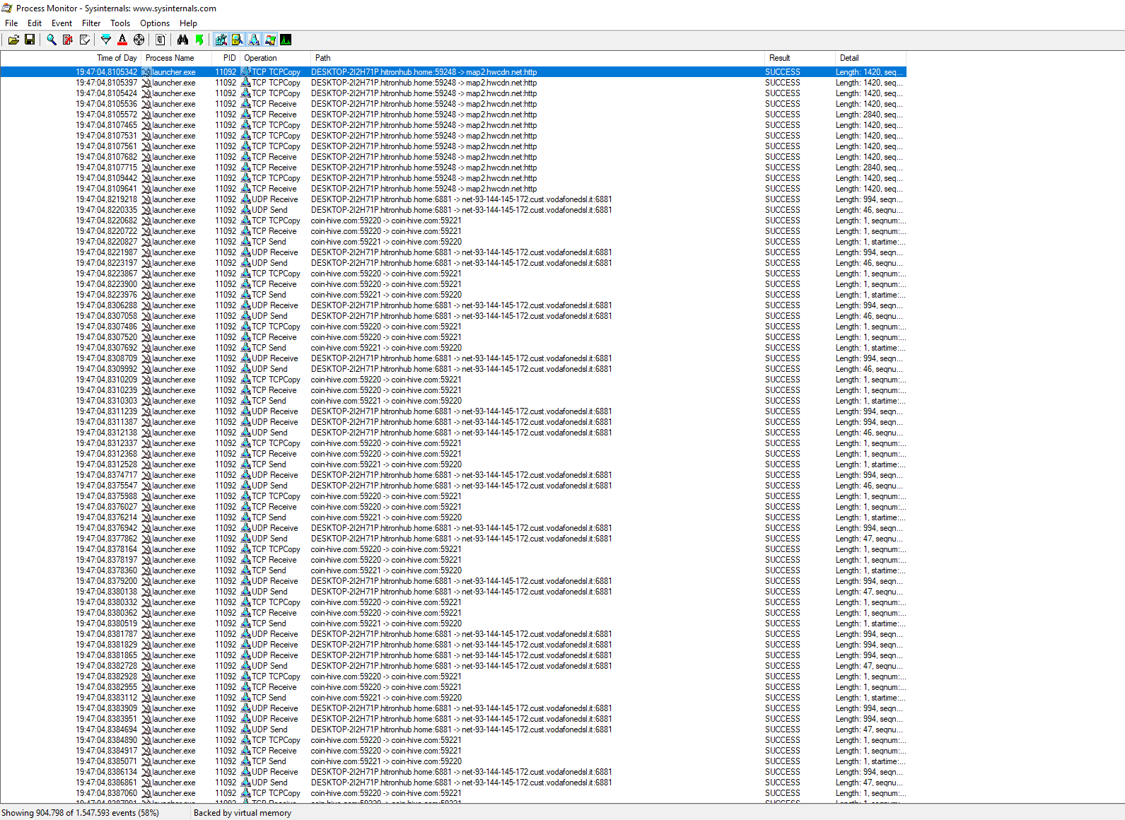Um unnötigen Traffic zu filtern, hatte ich daher den Plan mit dem Process Monitor von den Windows Sysinternals https://docs.microsoft.com/de-de/sysinternals/downloads/procmon relevante Daten wie PID auszulesen und als Filter in Wireshark zu applizieren.