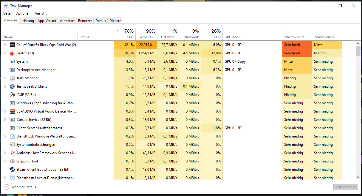 Wenn ich Cold War spiele ist am anfang die Ram auslastung so bei 6GB und steigt mir der Zeit bist der Arbeitspeicher voll ist