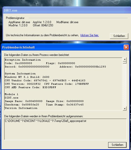 ich hab das fette Problem das das Spiel erst gar nicht startet. Sprich ich klicke .exe dann erscheint kurz das Dirt bild dann wird der Bildschirm schwarz und paar Sekunden Später dirt.exe hat ein Fehler blablabla und muss beendet werden.