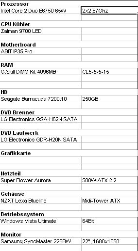 Hab ne GTX 260 Black Edition von XFX und nen Abit Pro35 Motherboard (falls es weiterhilft). Dazu kommt dann noch Vista Ultimate 64Bit + SP1! Soviel mal zu den Grundvoraussetzungen.