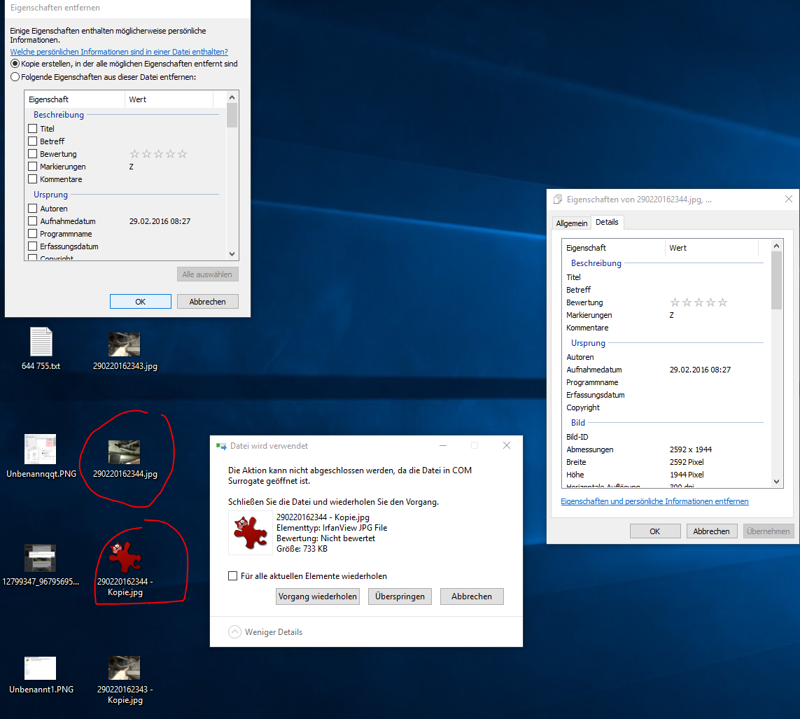 nach nur 5 tagen windows 10 bin ich mir sicher dass iche s gut finde aber wieder löschen werden.-.. alles ist so gemacht damit die überwachung der user perfekt ist .. aber egal.. weiss jemand wie man die bild info entfernen kann.. windows blockt wegen COM Surrogate.. klicl ich auf abbrechen verschwinden wieder die zwei dateien in roten kreis 0o