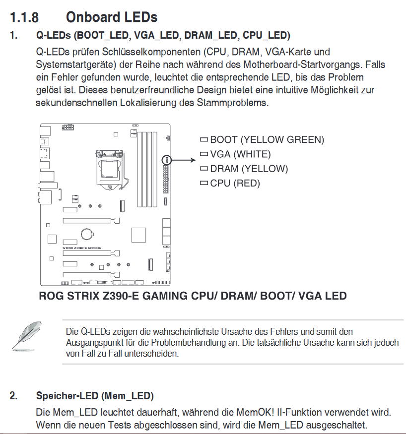 Es tut sich nix. Der mitgelieferte kleine Speaker piepst auch nicht nach dem Anschließen. Auf dem Board hats rechts oben einen Schalter für MemOK Test. Dieser ist "on" Drunter hats 4 kleine Dioden für Boot, VGA, RAM, CPU. Keiner dieser Dioden rührt sich.