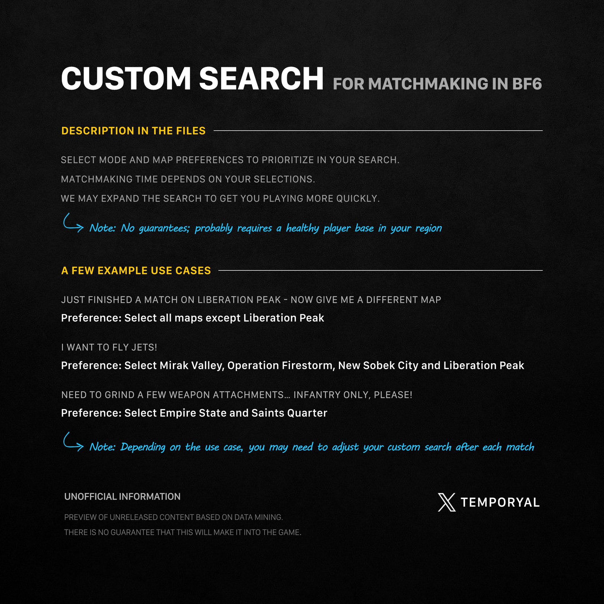 A "Custom Search" option teased in Battlefield 6 files might let you set preferences (maps & modes) for matchmaking.