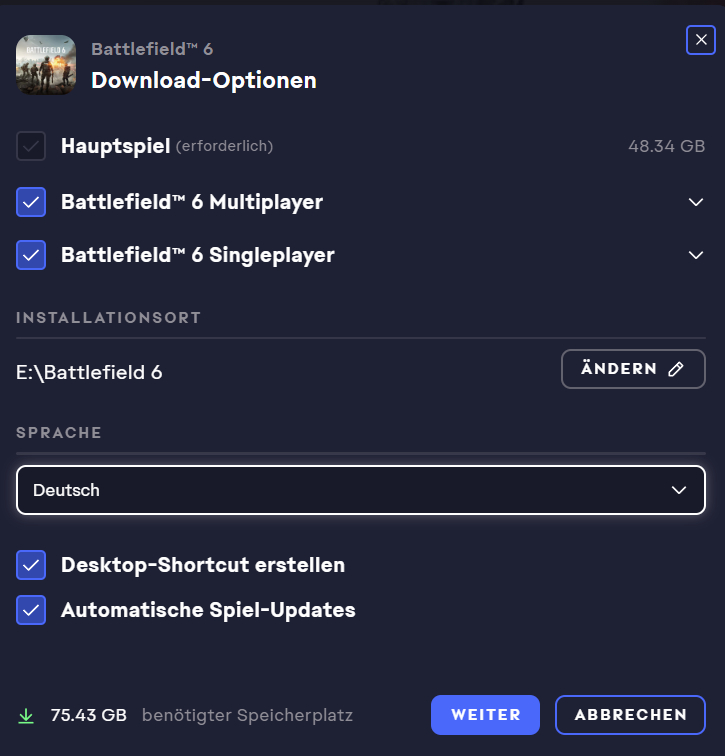 SERGE4NT schrieb:Ich überlege wieder mal im Ausland zu bestellen. Je nach dem in welchem Land (VPN) man bei EA kauft, ist die Sprache in BF nicht deutsch. War seit BF5 jedenfalls so.