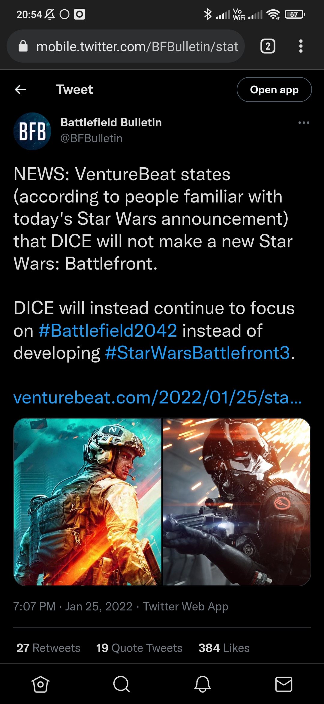 Vielleicht gibt es sogar noch eine etwas positive Nachricht zum Ende des Tages, DICE wird kein battlefront 3 machen, sie wollen sich auf 2042 konzentrieren.