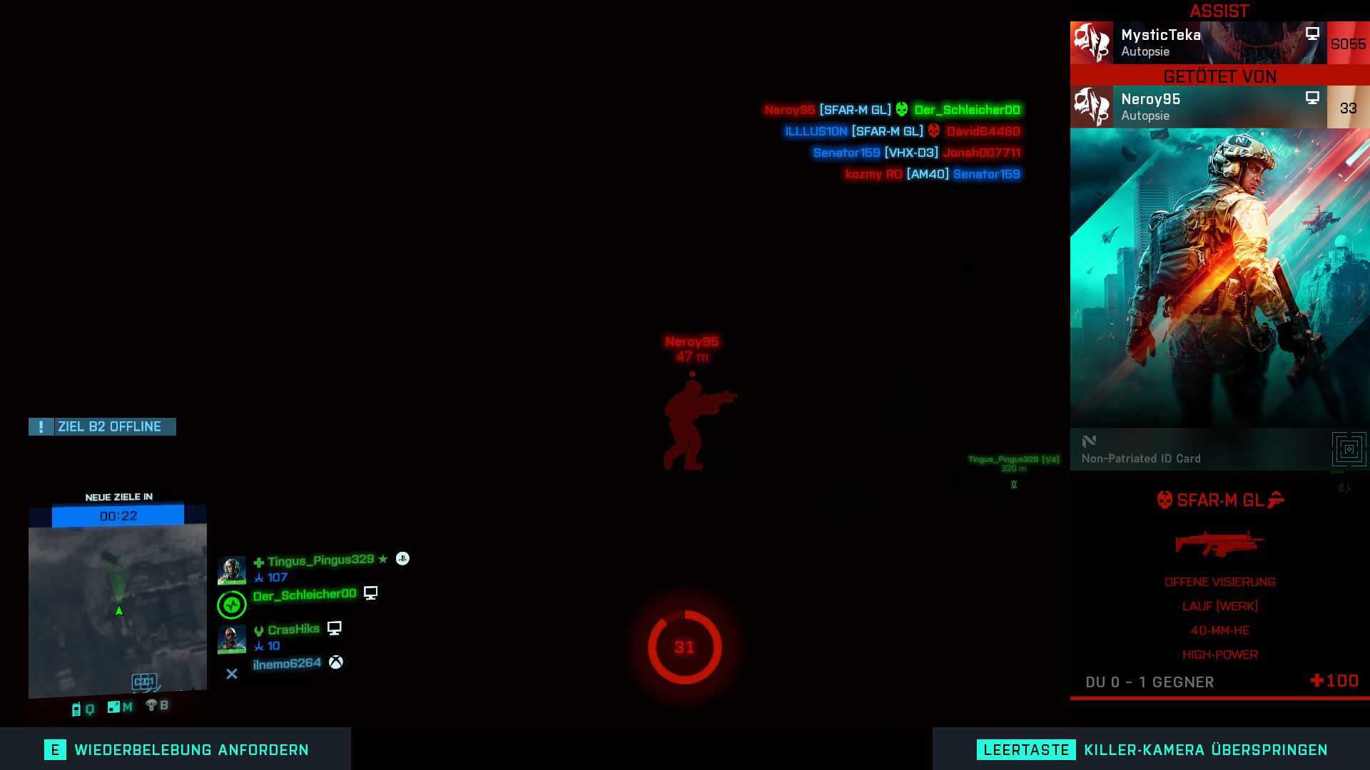 Die andere Person mit 2-11 hat wenigstens mit angegriffen und wiederbelebt. Ein weiterer im Squad ist komplett planlos durch die Gegend gelaufen (Level 87).