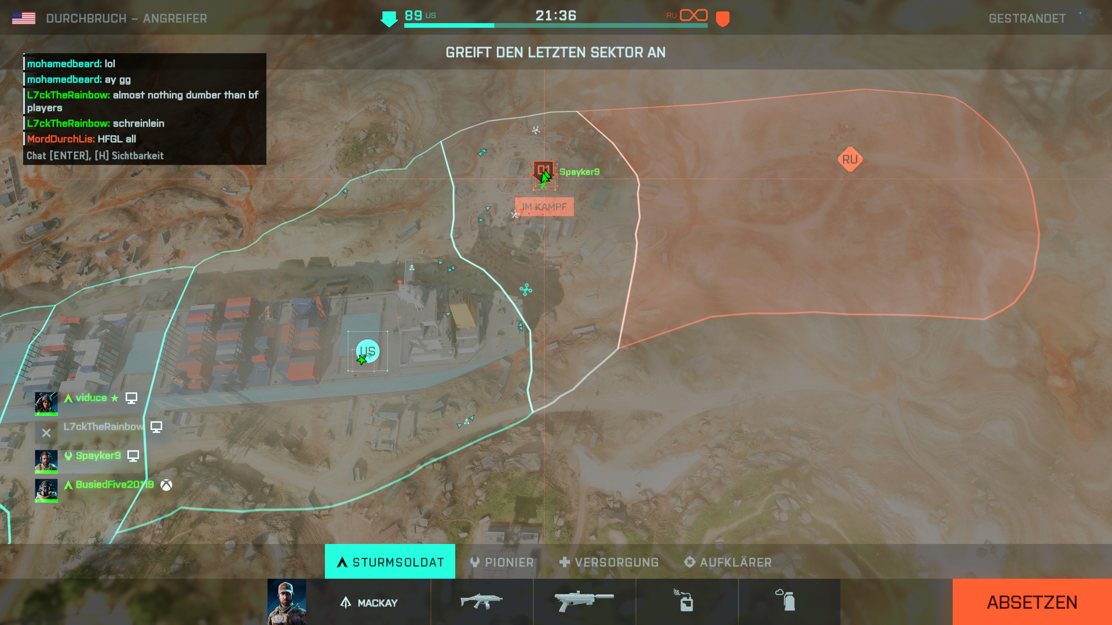 Es kotzt einfach an.... 20+ Personen campen im RUSH Mode außerhalb der Capture Zone....während der Gegner (rote Punkte) mit allen 32 Leuten in der Zone steht....komisch dass wir verloren haben.....