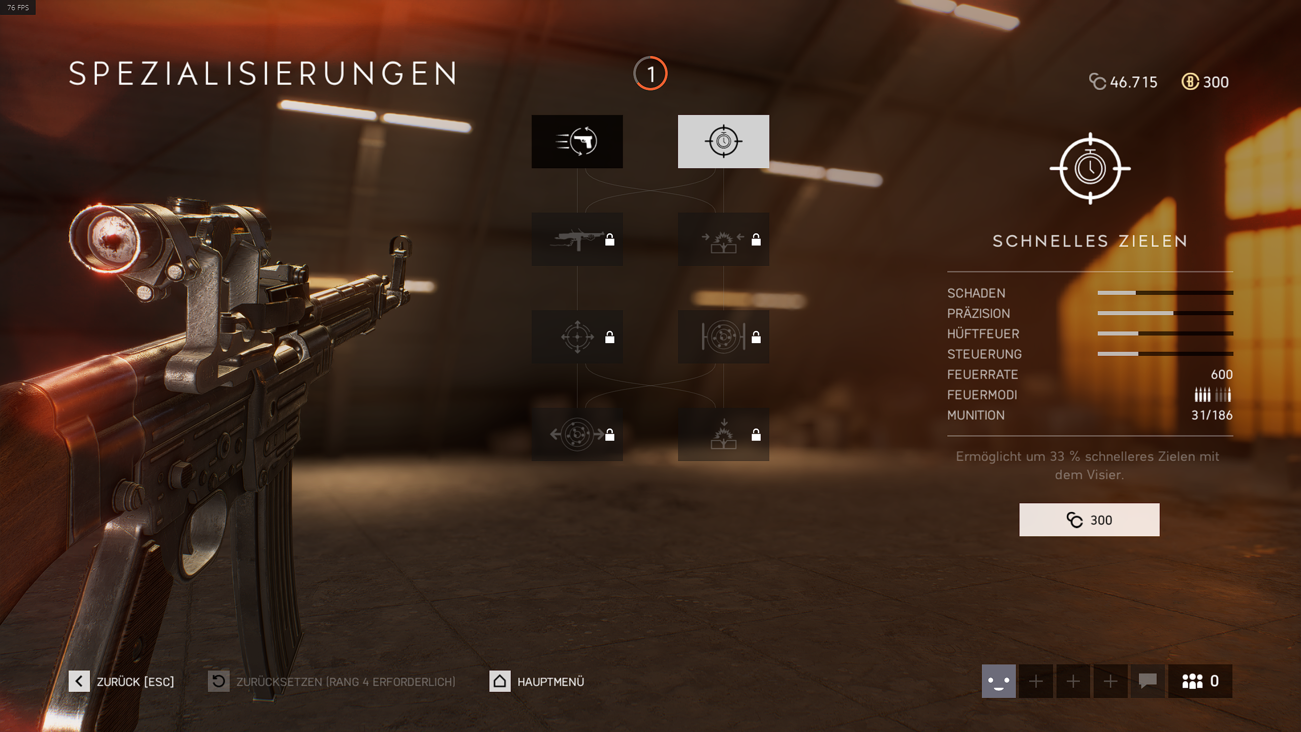 Jetzt bin ich von ursprüngliche Waffe Sturmgewehr 1-4 den ich bis level 10 aufgestockt habe, auf Sturmgewehr 44-er gewechselt, der trotz Level 0 und kaum Spezialisierungen, schon im Ausgangposition gleiche Eigenschaften wie bisherige Waffe hat.