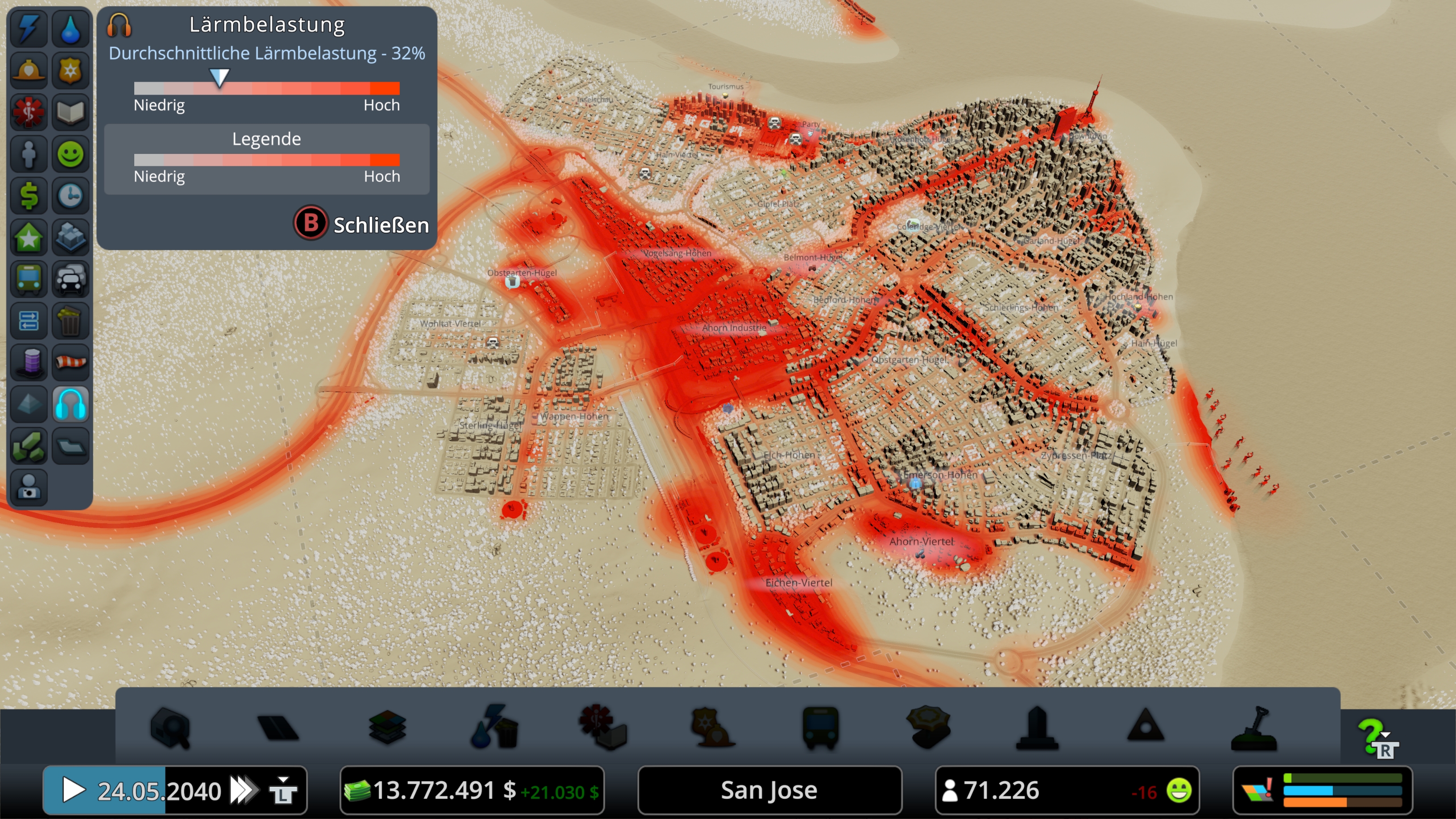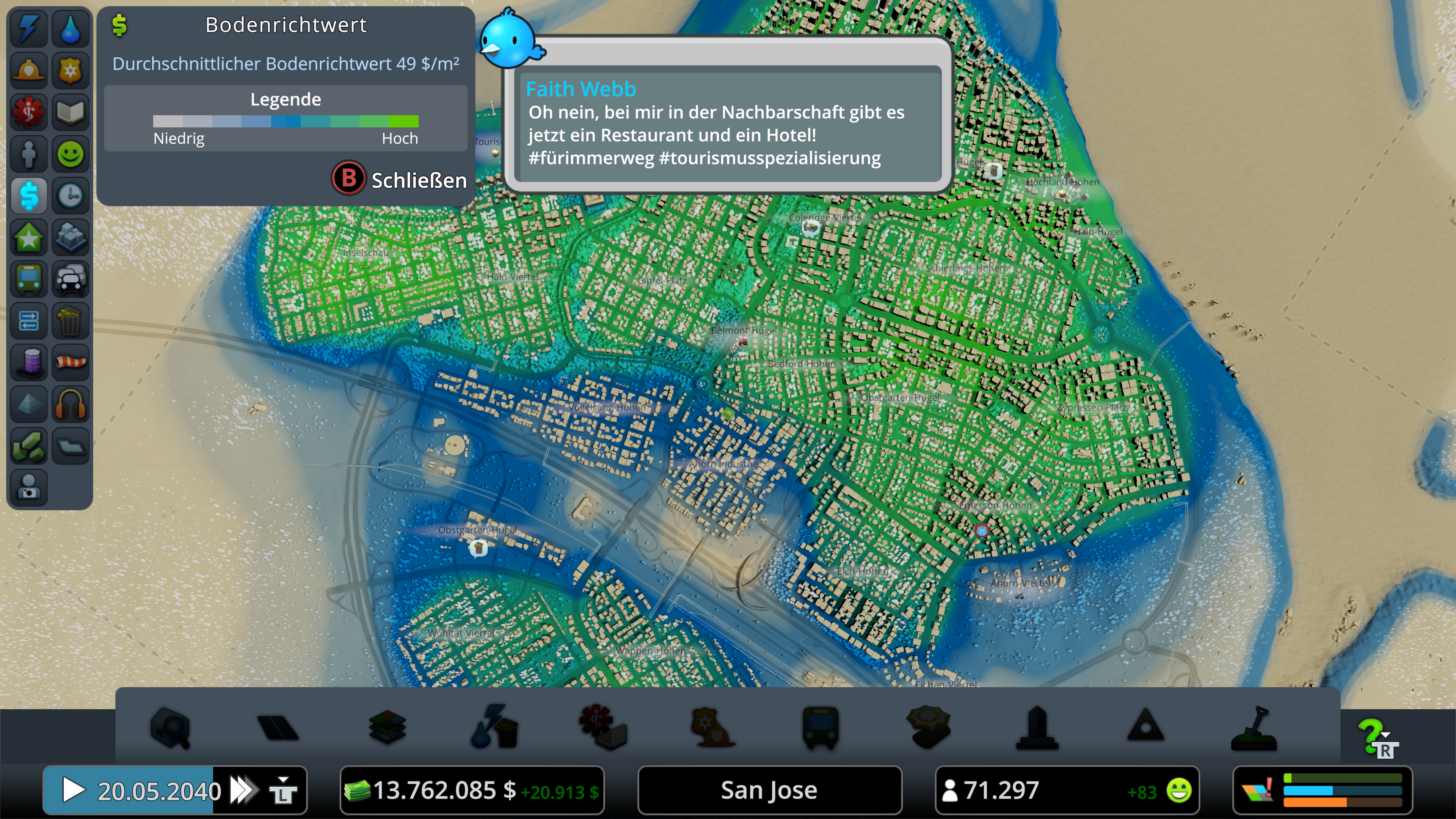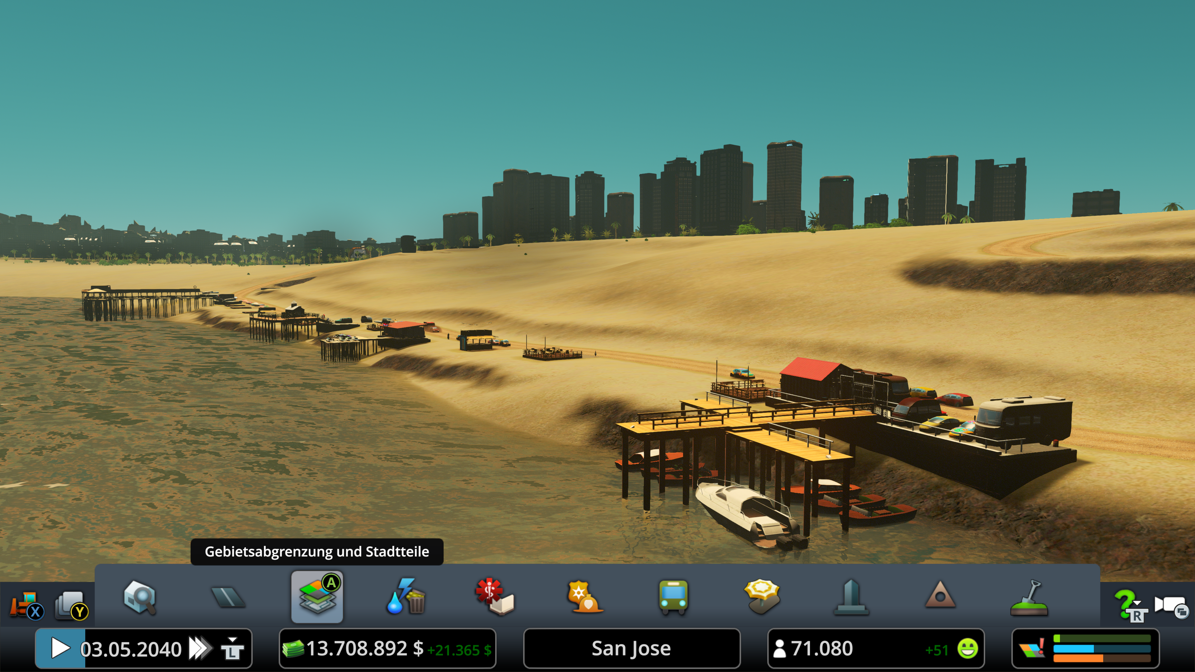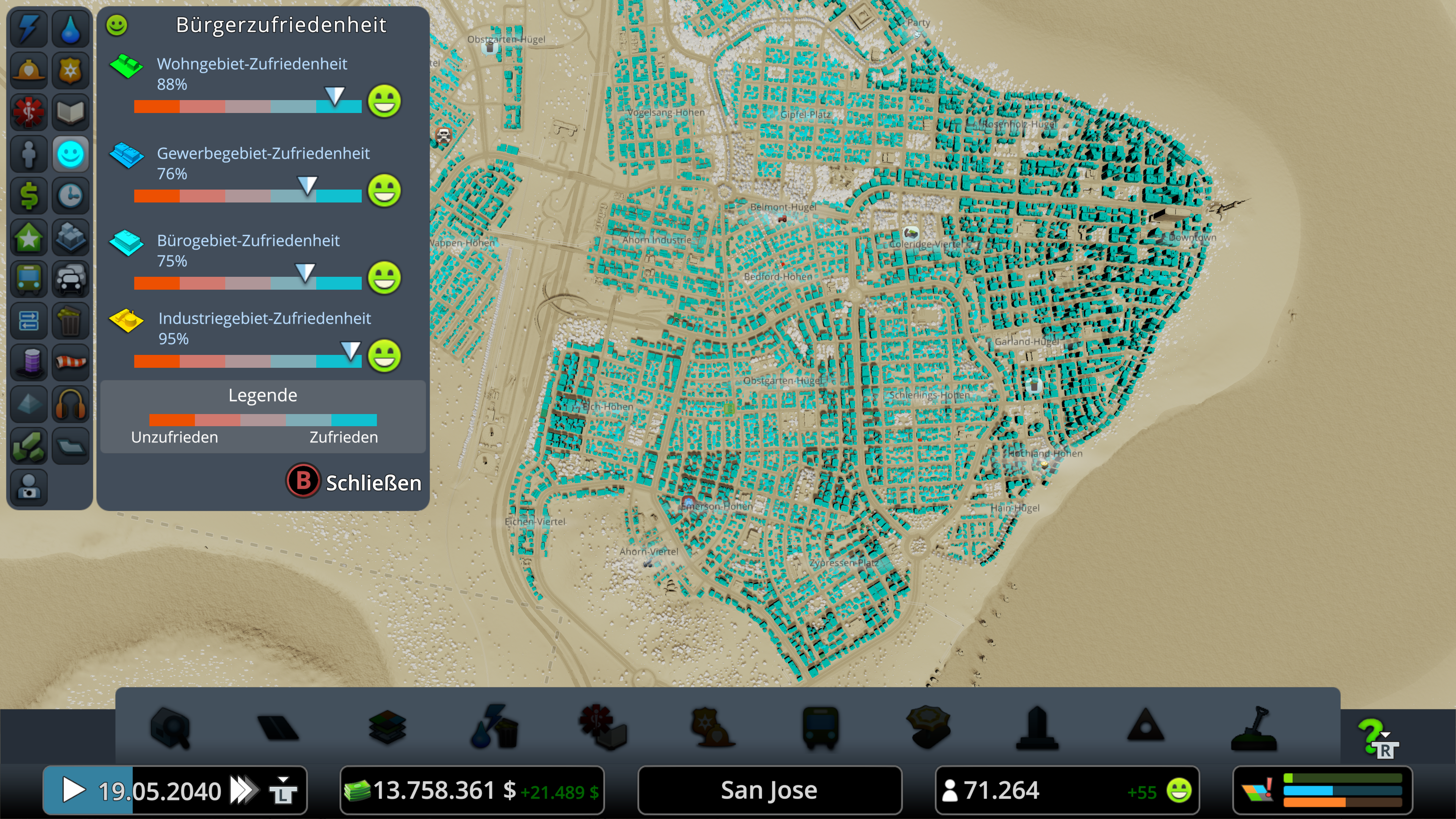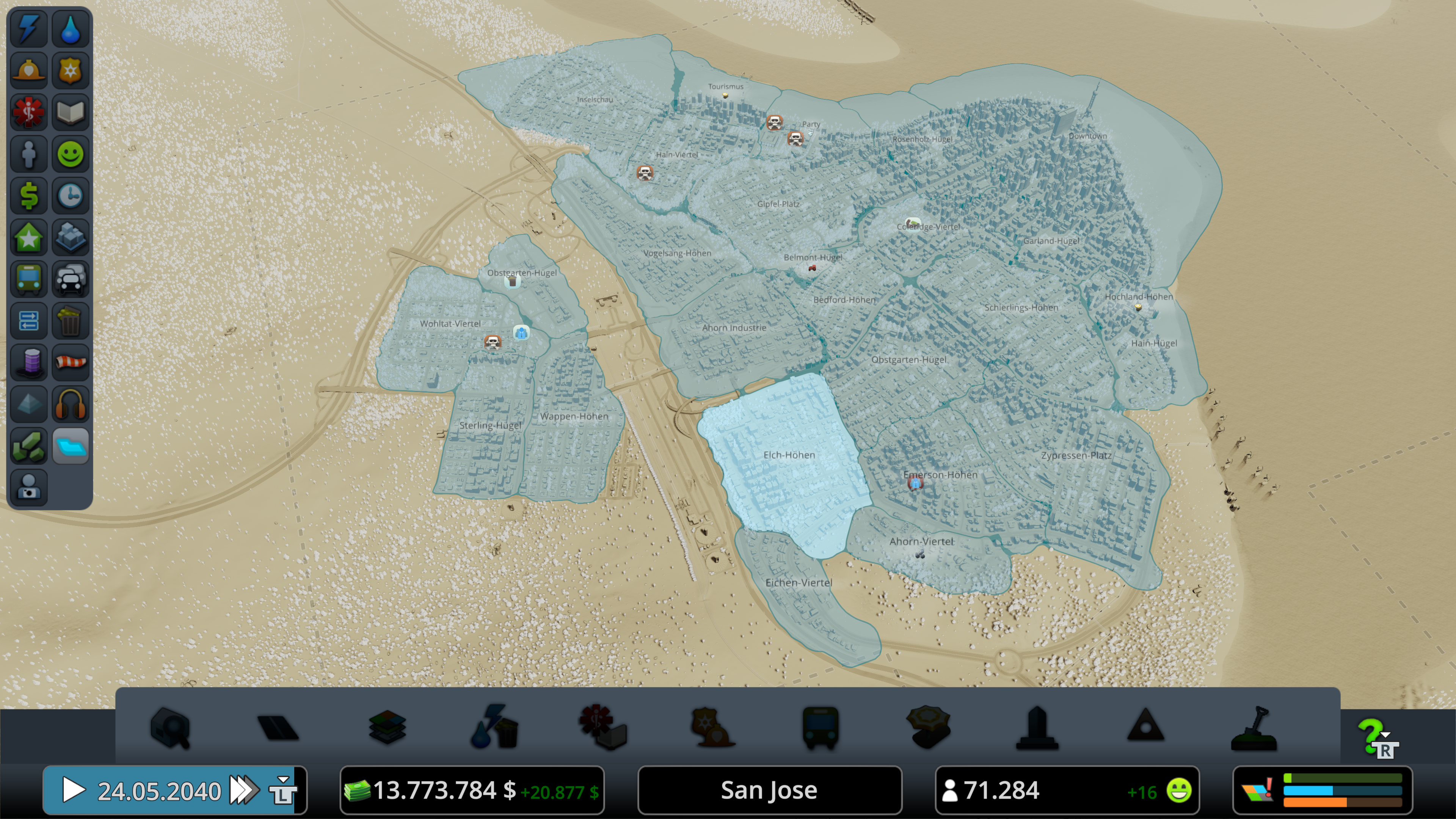 Ein paar kleinere Probleme gibt es in einer so großen Stadt natürlich immer, aber damit kann ich weiterhin leben. Im Übrigen habe ich ÖPNV aufgrund des gutes Verkehrsfluss erst bei über 55.000 Einwohner integriert und bin da mit der Abdeckung noch mittendrin und nicht fertig. Dafür habe ich seit Beginn viel auf Fahrräder gesetzt.