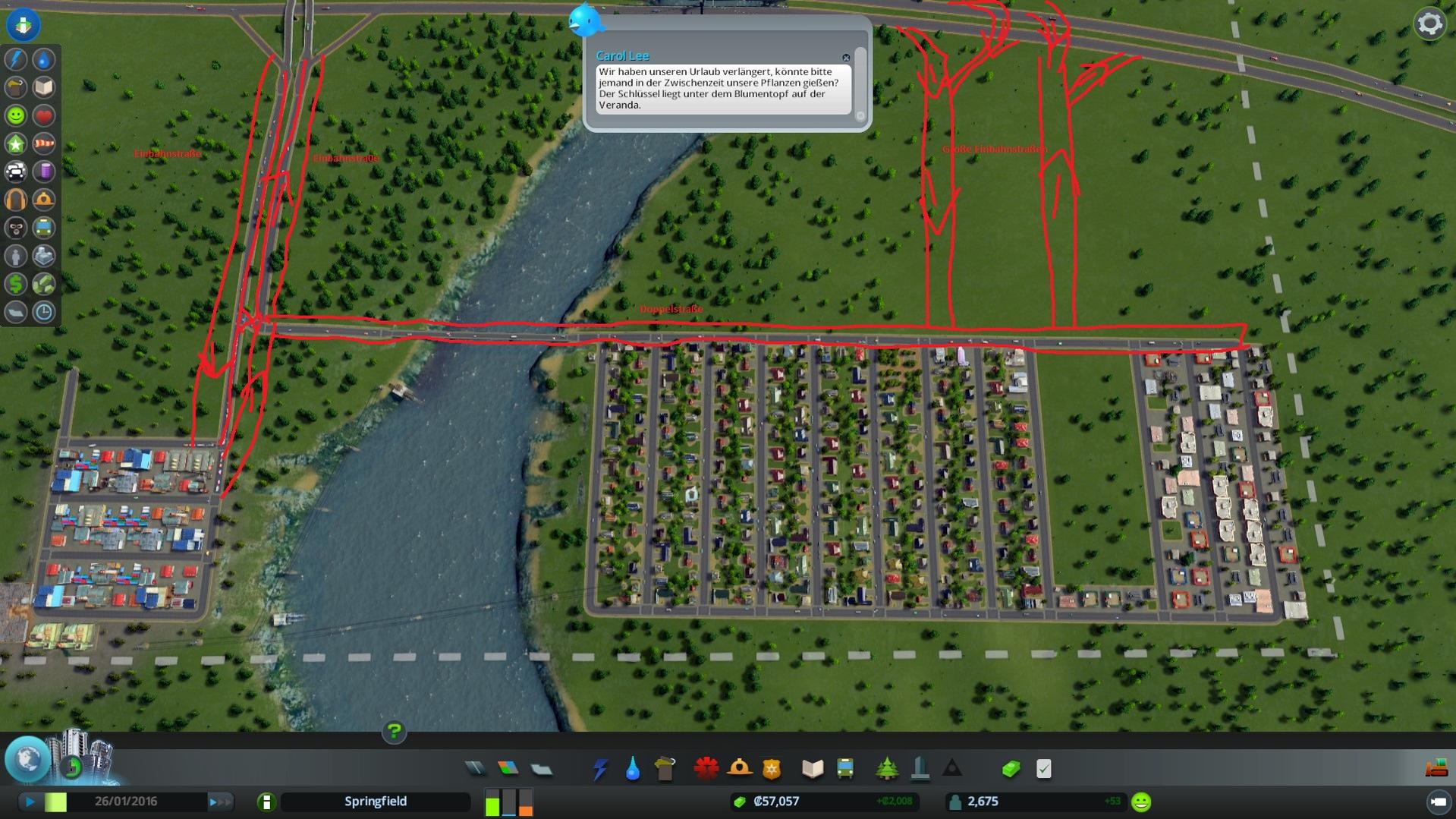 Edit: Mit den roten Pfeilen natürlich keine Kreuzungen erzeugen, sondern über die Straßen bauen.