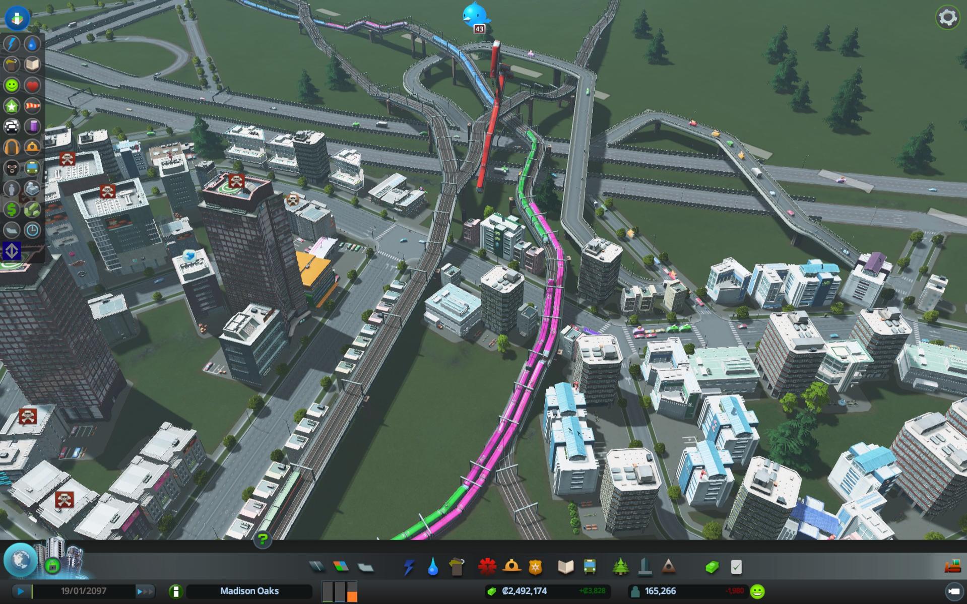 Ich hatte ziemliche Probleme mit meinem Bahnverkehr. Ich bin dann einem Tipp gefolgt, dass man den internationalen Schienenverkehr nur an den Güterverkehr anbindet. Für den Personenverkehr einen eigenen, unabhängigen Kreis bauen. Funktioniert auch soweit super. Allerdings ist beim Bauen einer der Züge "hängen geblieben". Ich hab schon die Schienen drumherum alle mal entfernt und anders gesetzt. Auch das Spiel schon mehrfach gestartet. Der will einfach nicht weg. Zudem blockiert er, wie auch immer die unteren Fahrspuren, aber seht es euch selbst an.