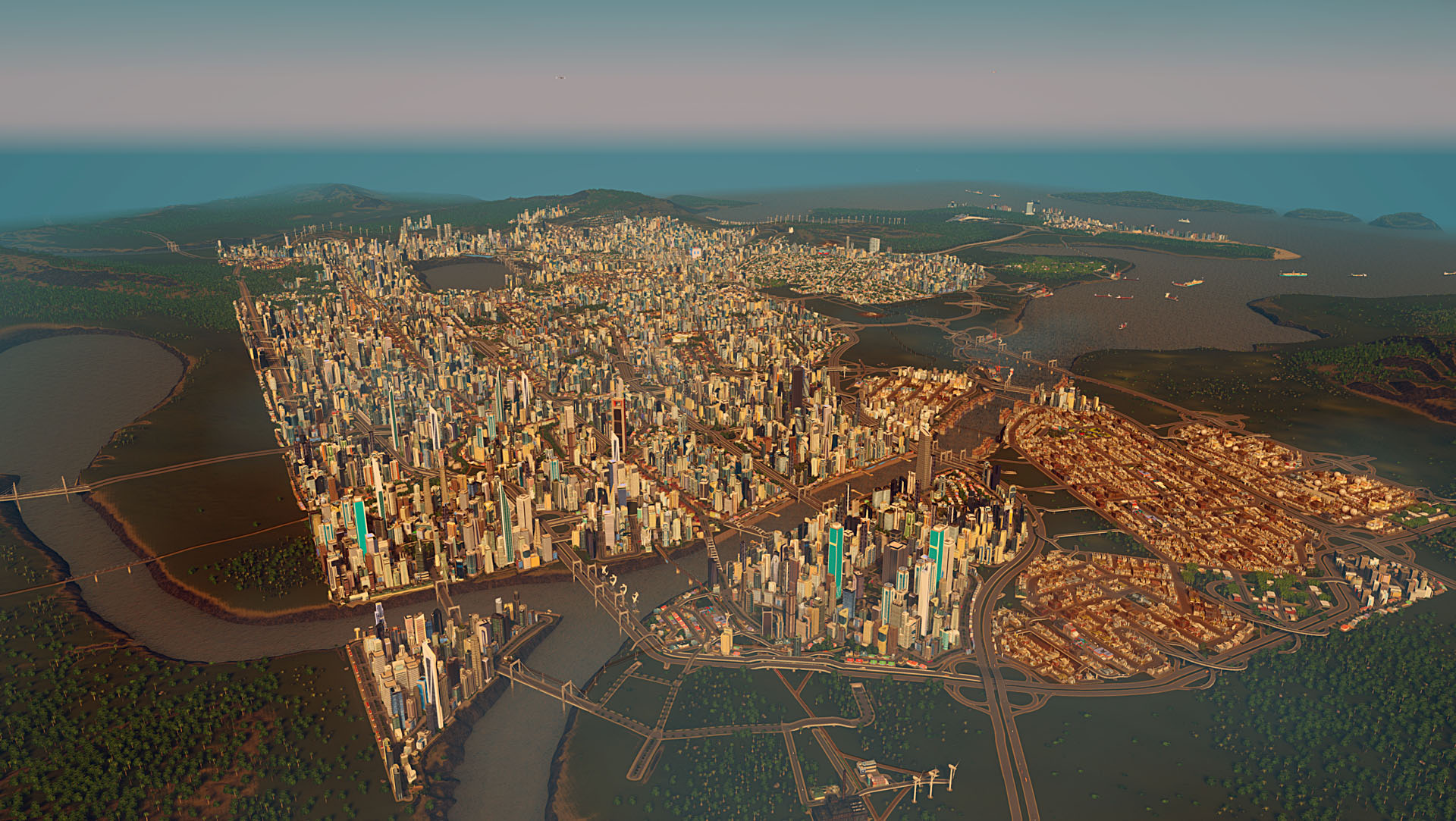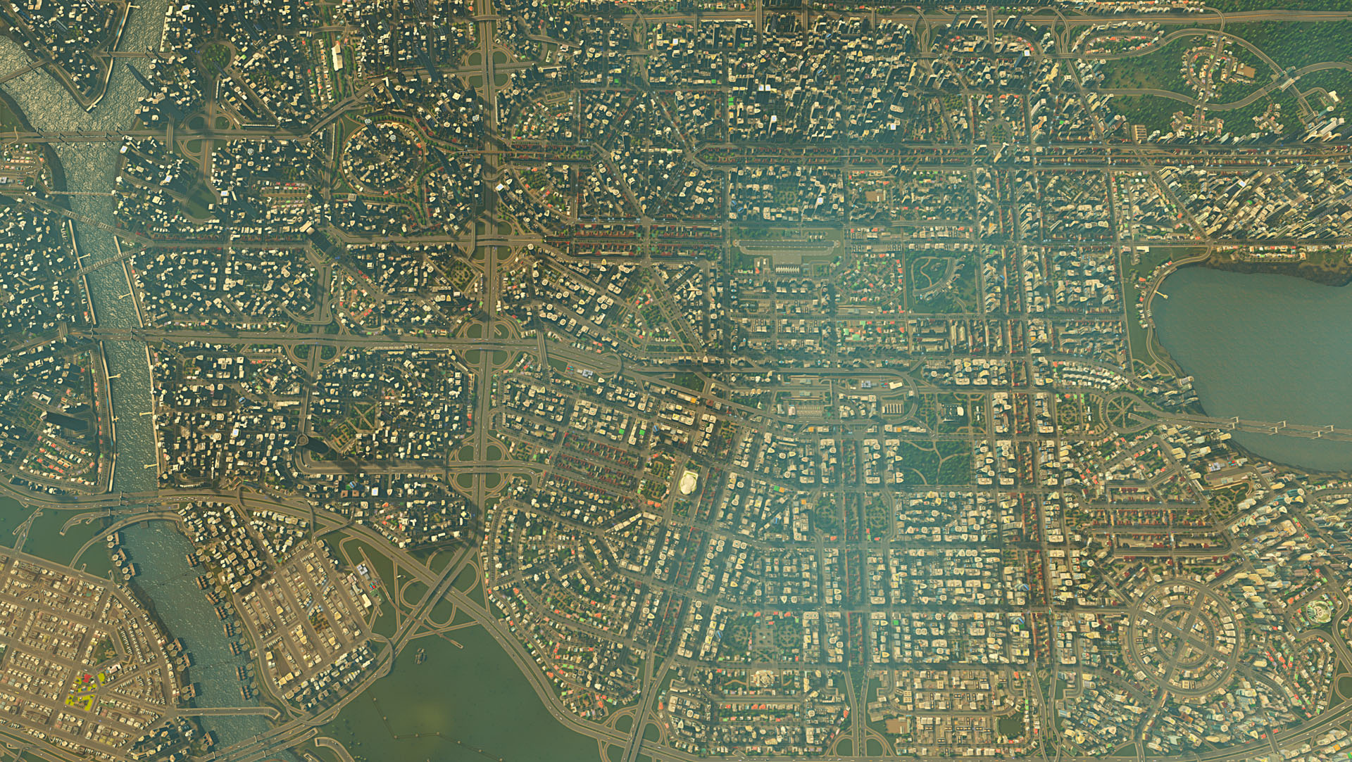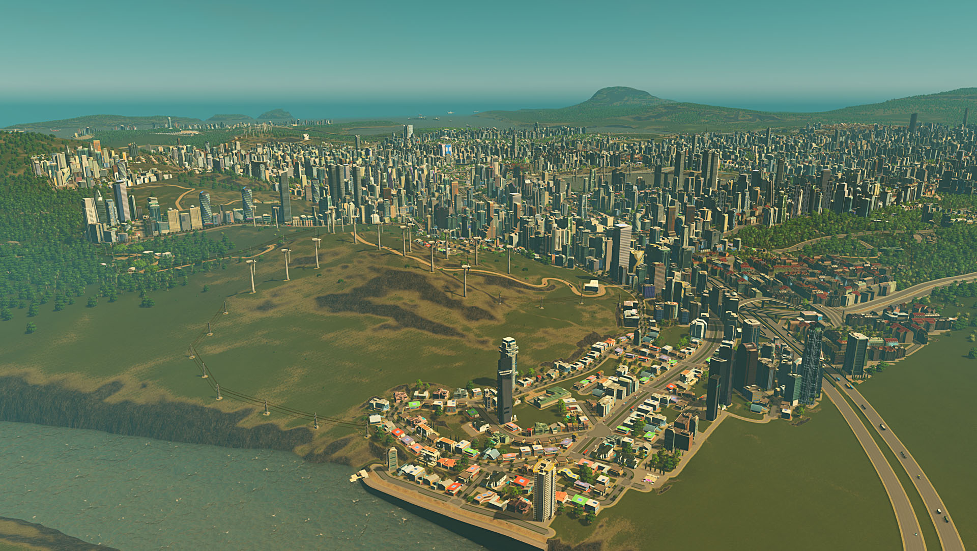 Man muss auch nicht die ganze Karte bis zum Rand bebauen, sondern kann kleinere Siedlungen etwas ausserhalb erschaffen. Zudem kommt es meiner Meinung nach ganz gut, wenn man auch mal den europäischen Baustil einstreut und auch im "Late-Game" noch Low-Density Wohngebiete baut (und diese mit einigen wenigen Wolkenkratzern interessanter macht):