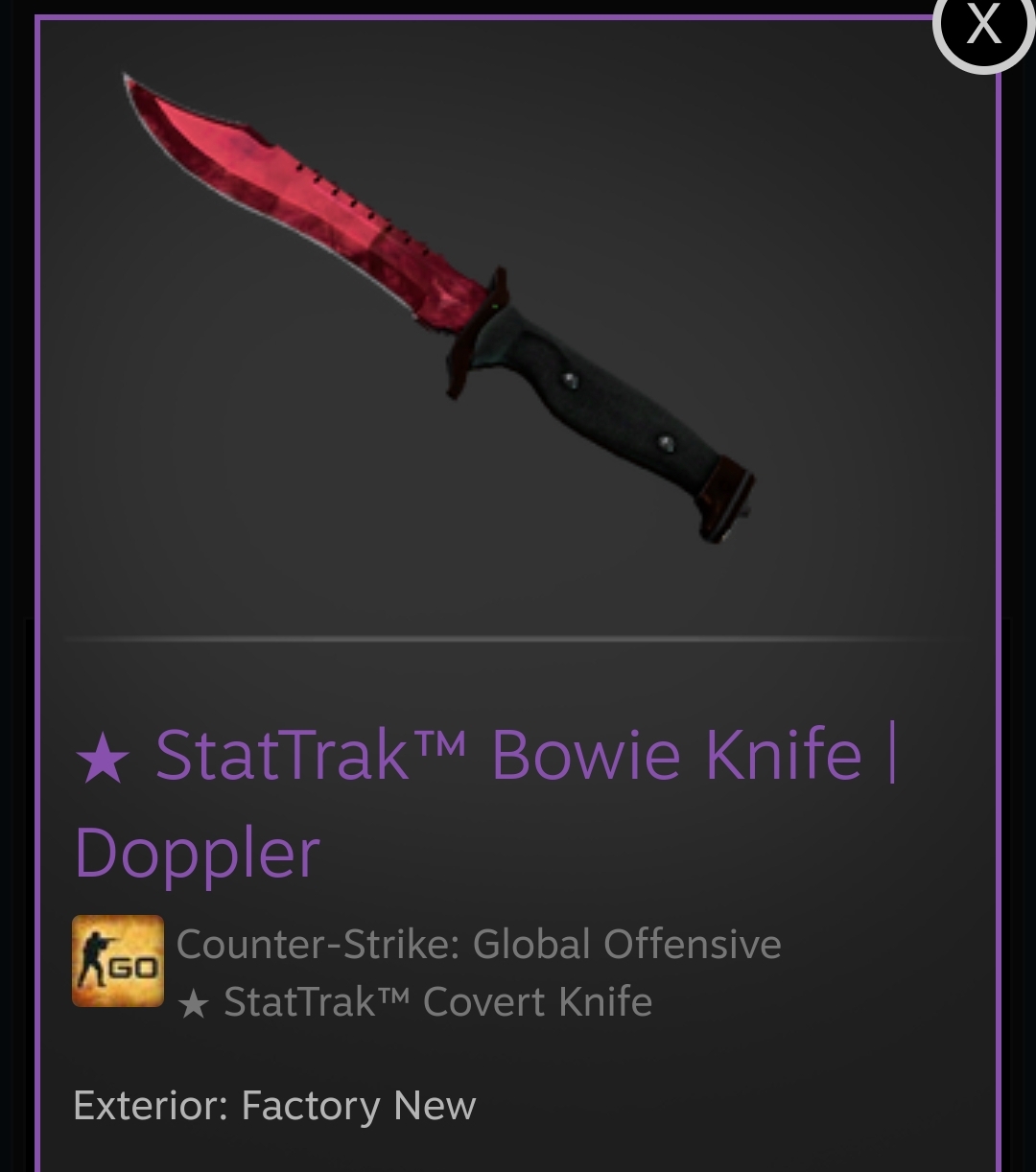 Ich habe jetzt mal auf Skinport nachgeschaut, dort wird günstigste Bowie Knife | Doppler (Ruby) mit 1.782,20€ angeboten! (Zuletzt wurde es am 22. Mai 2023 für 1.750€ verkauft)