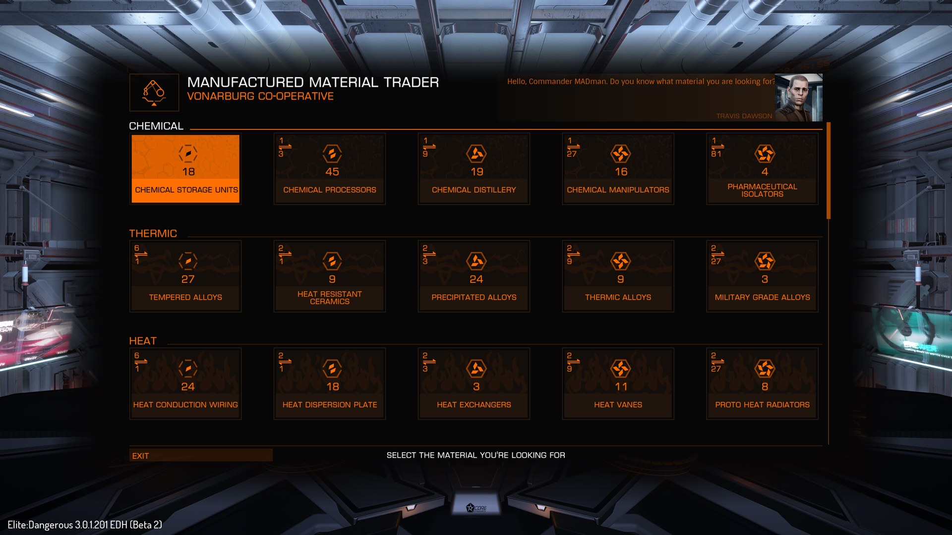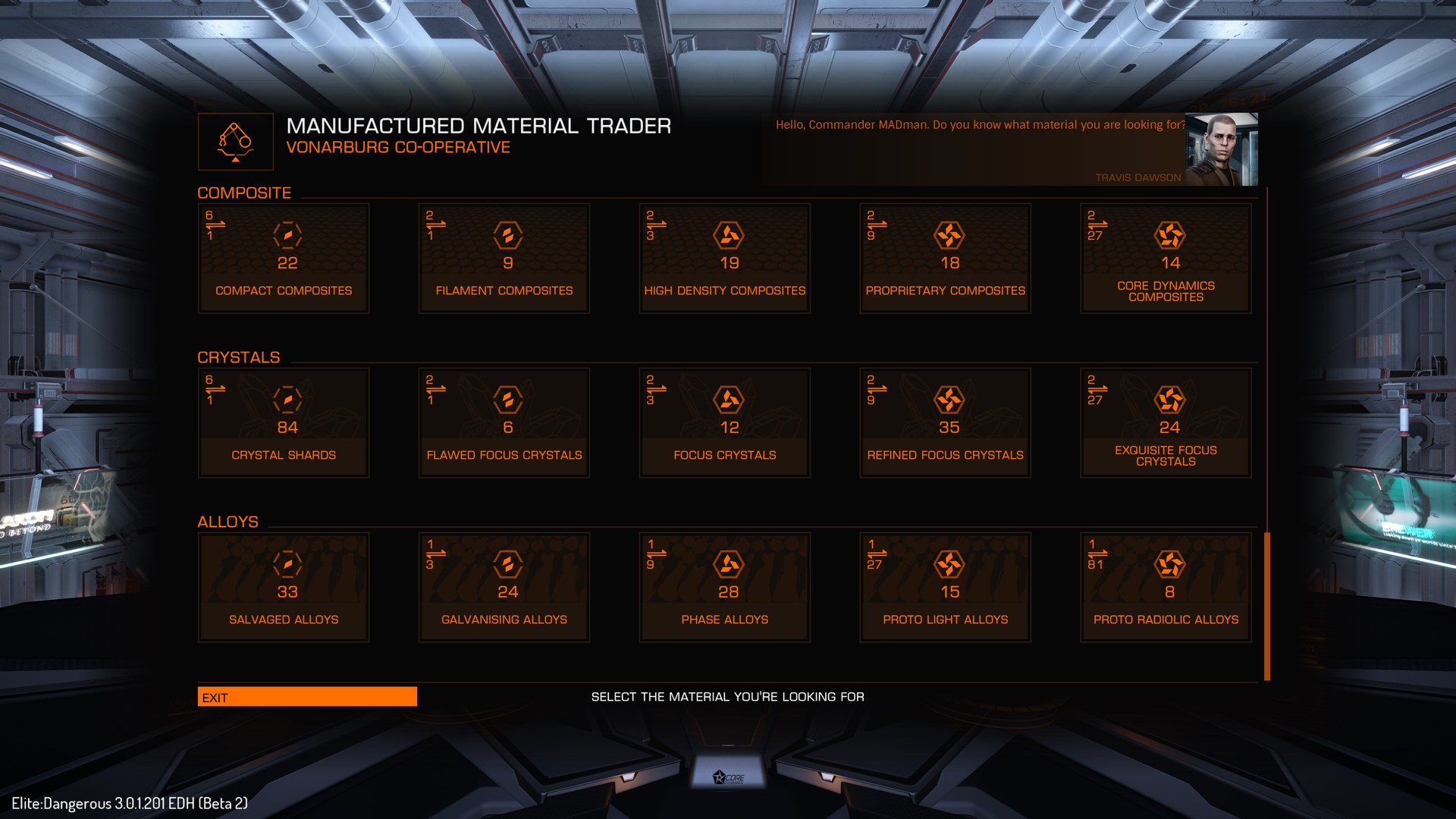 Auch Feldreparaturen musste ich schon durchführen, weil durch die zahlreichen Neustronensternsprünge mein FSD auf unter 80% gefallen war und anfing Fehlfunktionen zu zeigen. Also ne ruhige Ecke gesucht und aus dem Spuercruise gedroppt, meine Thruster temporär deativiert um genug Energie für meine Feldreparatureinheit zu haben, alle Systeme einzeln repariert und wieder gebootet. Da ich auch mal einem Stern zu nahe kam und ein paar Rumpfschäden hatte, habe ich noch ein paar Drohnen gebastelt und die Hülle repariert. Lediglich gegen die 98% die mein Powerplant noch hat kann ich nix tun, also besser aufpassen in Zukunft