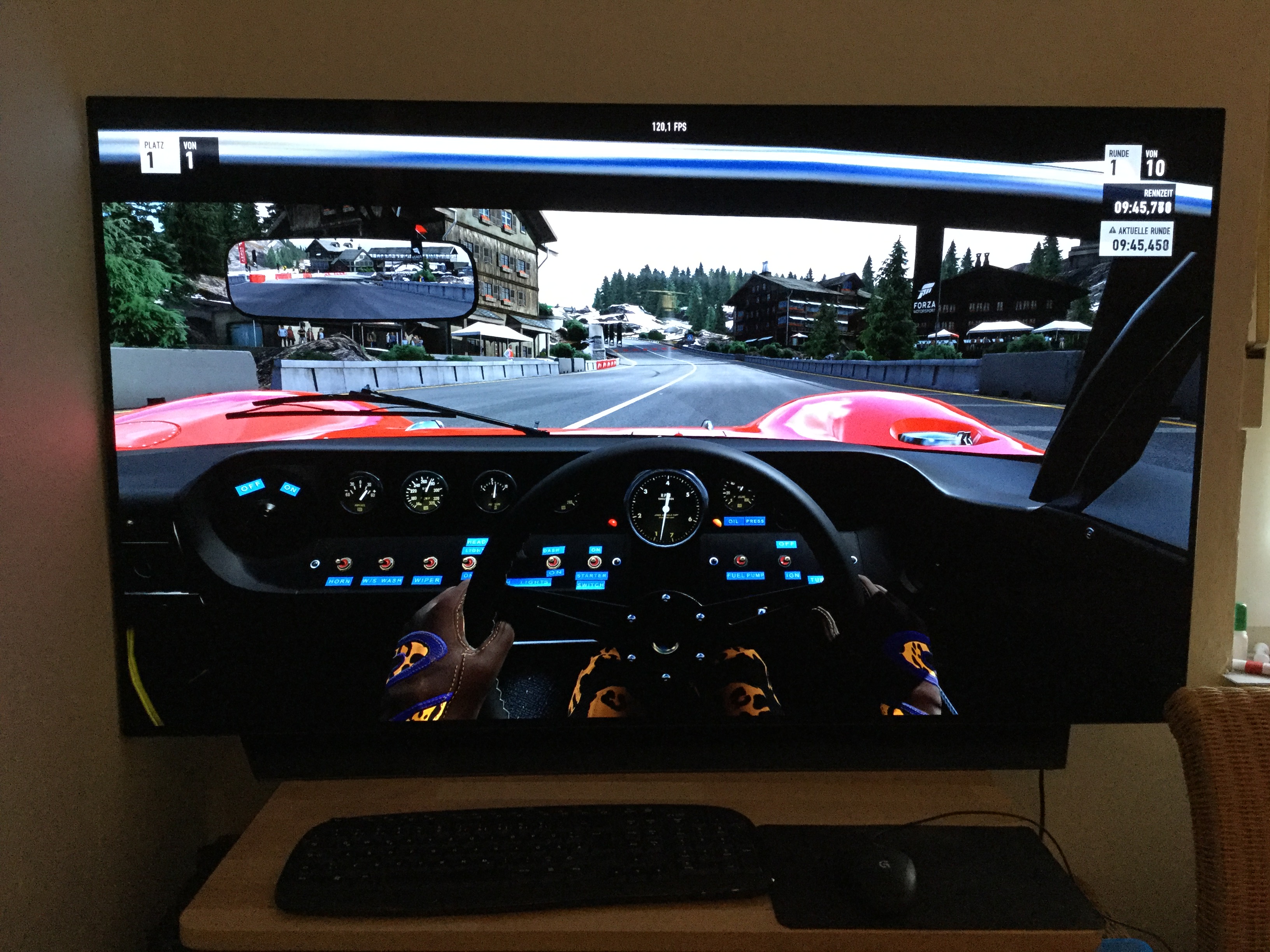 hab nämlich vor einer stunde meinen zum testen bestellten oled tv lg 55 c bekommen und erst mal noch ohne wandhalterung auf mein kleines tischchen plaziert um mal zu allererst anzutesten ob mit meiner ollen gtx1080 wohl forza 7 zumindest in 1440p mit 120 fps läuft und hurra: es läuft astrein.