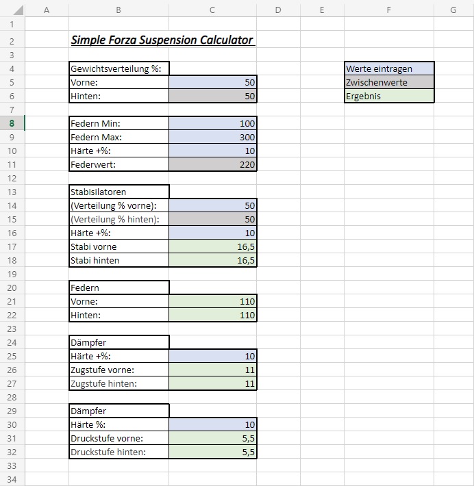 Muss ich mich mal dran versuchen. Habe heute angefangen mir (für meine Art des Tunings), in Excel, einen simplen Calculator fürs Fahrwerk zu schreiben. Das erste Ergebnis mit dem 2018 Porsche 911 GT2RS war echt gut.
