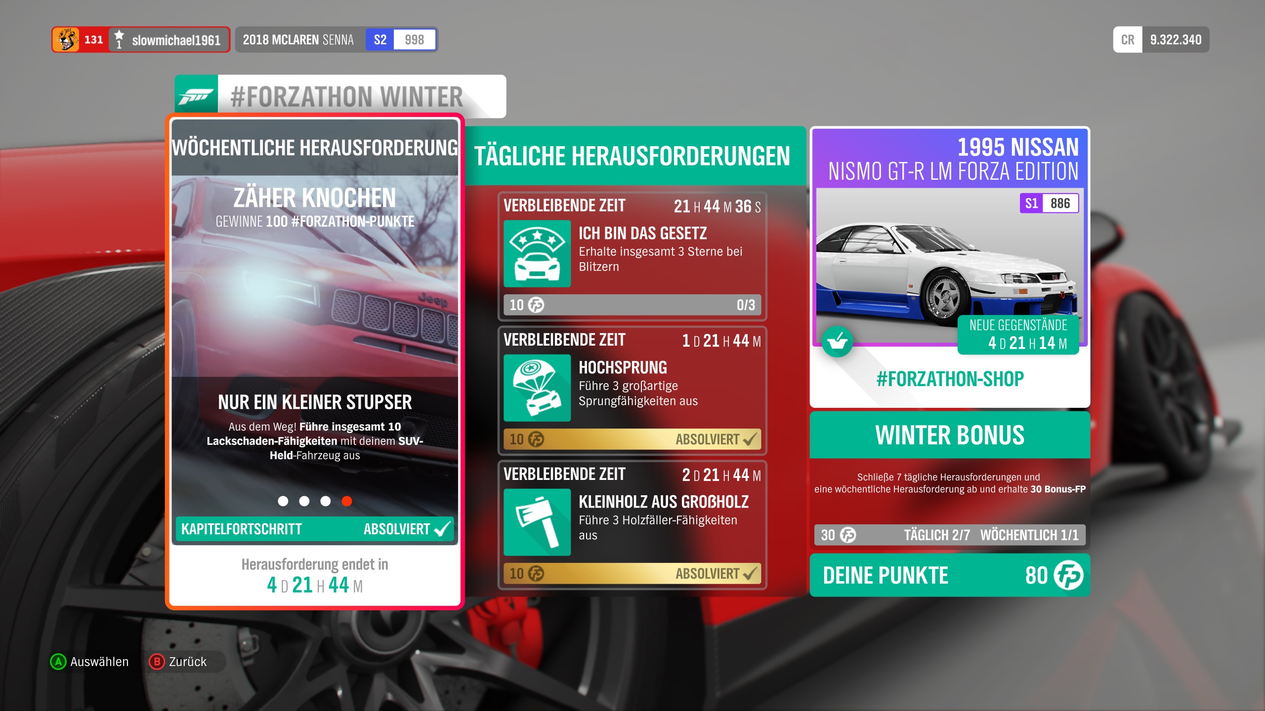 Also ich bin die Challenge mit nem Jaguar F-Pace auf S1 900 gefahren und es hat alles funktioniert. Rumfahren, Müllmann-Fähigkeiten (geht gut in Edinburgh), 3 Rennen gewinnen und zum schluss noch Lackschaden-Fähigkeit, am besten im Einzelspielermodus über die Autobahn fahren und den Verkehr leicht berühren.