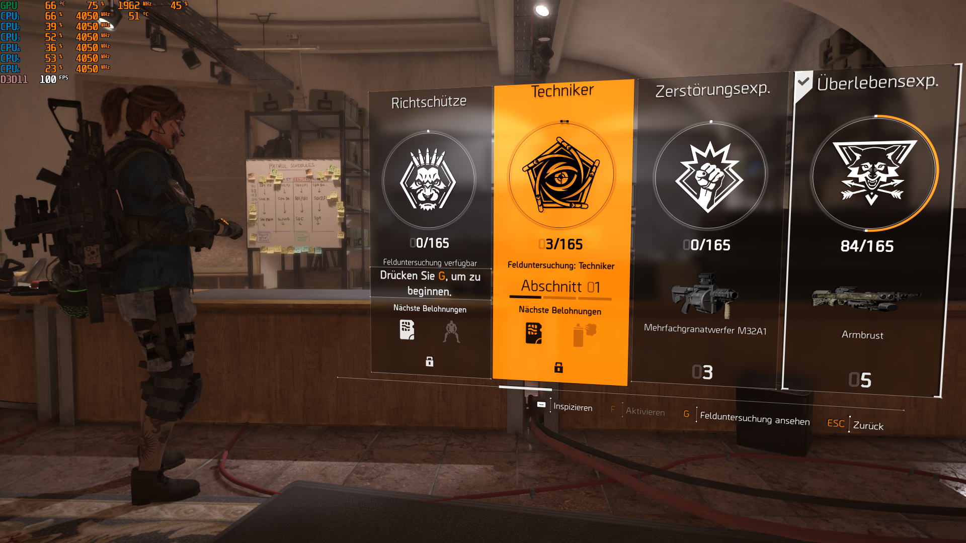 Kopfgeld in West Potomac Park, normale Weltschwierigkeit. Auf dem Weg dahin renne in einen named Hyena Tank. Seine lila Lakaien sind kein Problem, er selbst dafür umso mehr. Frisst fünf volle Magazine und fetzt im Gegenzug meine 800k Rüstung in einer Sekunde weg. Als er dann endlich im Dreck liegt hab ich keine Armor Kits mehr. Ungelogen zwanzig Meter weiter dann ein Warhound Konvoi. Normale Elitegegner sind wieder unproblematisch, es sind nur so viele dass ich am Ende keine Munition mehr habe und mit dem letzten ne Weile Katz und Maus spielen muss bis mir der Gunner Perk ein Magazin regeneriert.