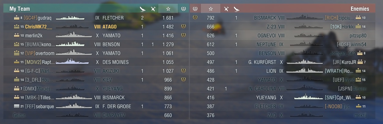 Ansonsten würde ich wohl auf die Yorck setzen und in den Nahkampf gehen, was mir mit den deutschen Kreuzern immer recht gut gelungen ist. Die AP der Yorck ist auf kurze Distanz (<10km) ja recht gut und im Knife Fight kann man die 6km Torps gut nutzen (da jeweils 2 pro Seite), dazu noch Hydro als Schutz gegen Gegentorps.