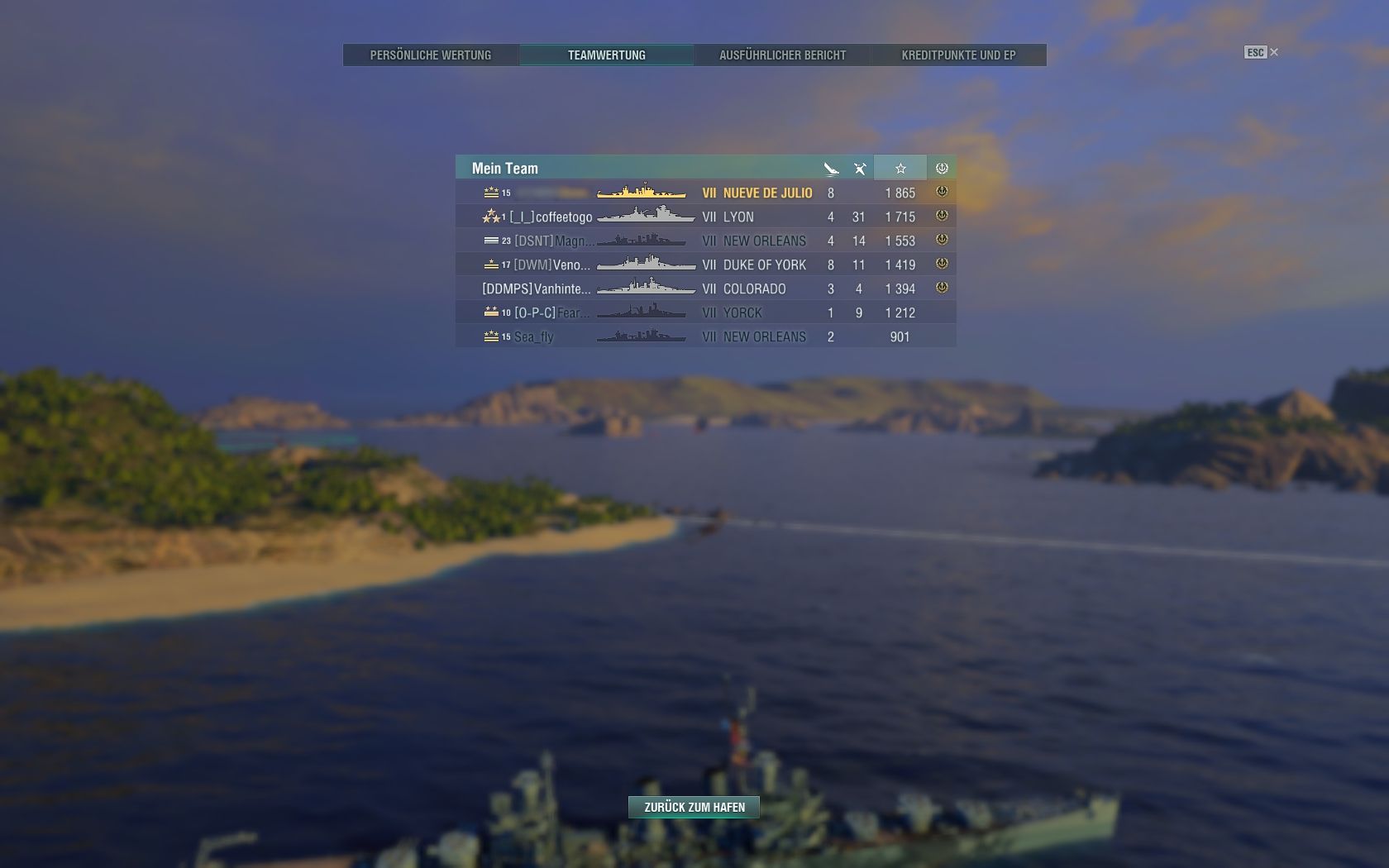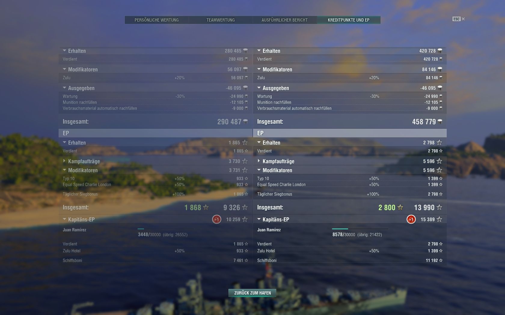 Was ich mit der Kohle mache? Erst mal ansparen. Und dann habe ich mir ein paar Speedboost-Flaggen gekauft. Da ich meistens Zerstörer fahre bin ich chronisch klamm.