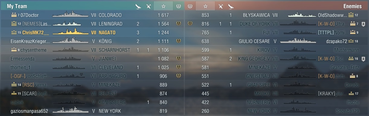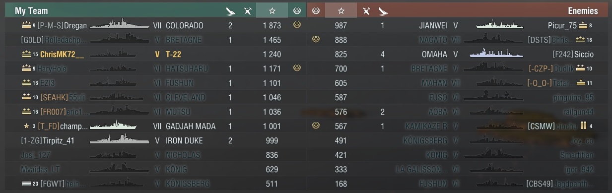 Und wenn man dann im Lategame CV Fahrer hat, die lieber mit dem CV versuchen die Gegner zu rammen und nicht mal mehr Ihre Fighter starten, um für den britischen Kreuzer die Gegner aufzudecken....da ist man hilf- und ratlos.....
