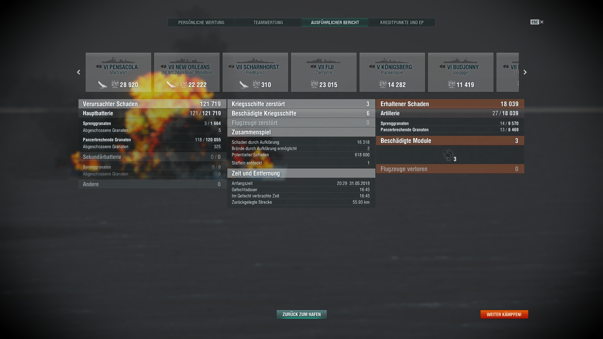 Ich habe die Reichweitenerhöhung für die Hauptgeschütze eingebaut und werde es in Zukunft mal auf etwas größere Distanz versuchen, zumal die Genauigkeit der Geschütze zwar nicht auf Kreuzer-Niveau, aber doch besser als bei Schlachtern ist.
