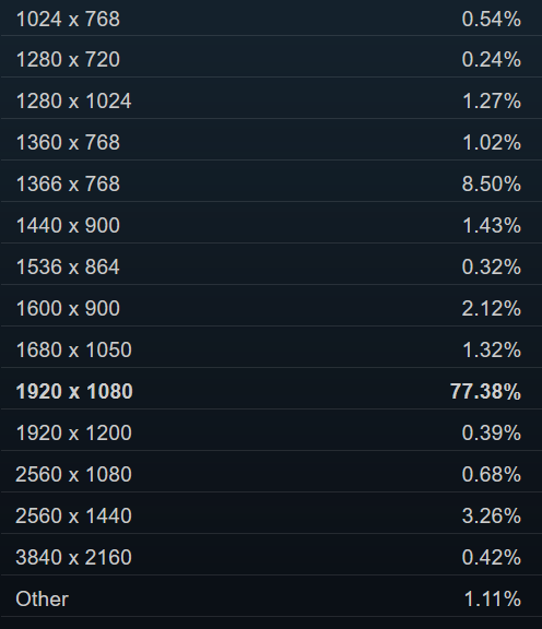 Naja...doch, da gibt es schon noch einige, vor allem ältere Monitore. Ziehen wir mal zum Vergleich die Steam-Hardwareumfrage heran:Count_Grishnak schrieb:Auch das Polling zeigt aktuell 3% 2560x1080 zu 14% "Andere", wobei FullHD, WQHD und UHD abgedeckt sind mit der Auswahl. Allzuviel bleibt also im "gängigen" Bereich nicht über.
