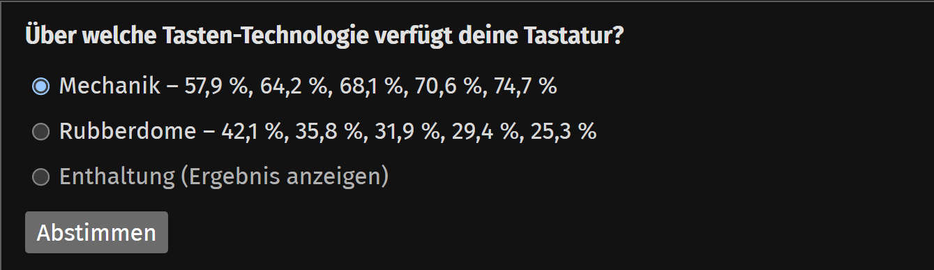 Spiegelt zumindest die Umfrage wieder, dass wir hier in in einem vernünftigen Enthusiasten Forum, welches und ich betone "vernünftig" ist und nicht komplett balabala so wie man es vermuten könnte, wenn man in manche Comment-Sections reinschaut