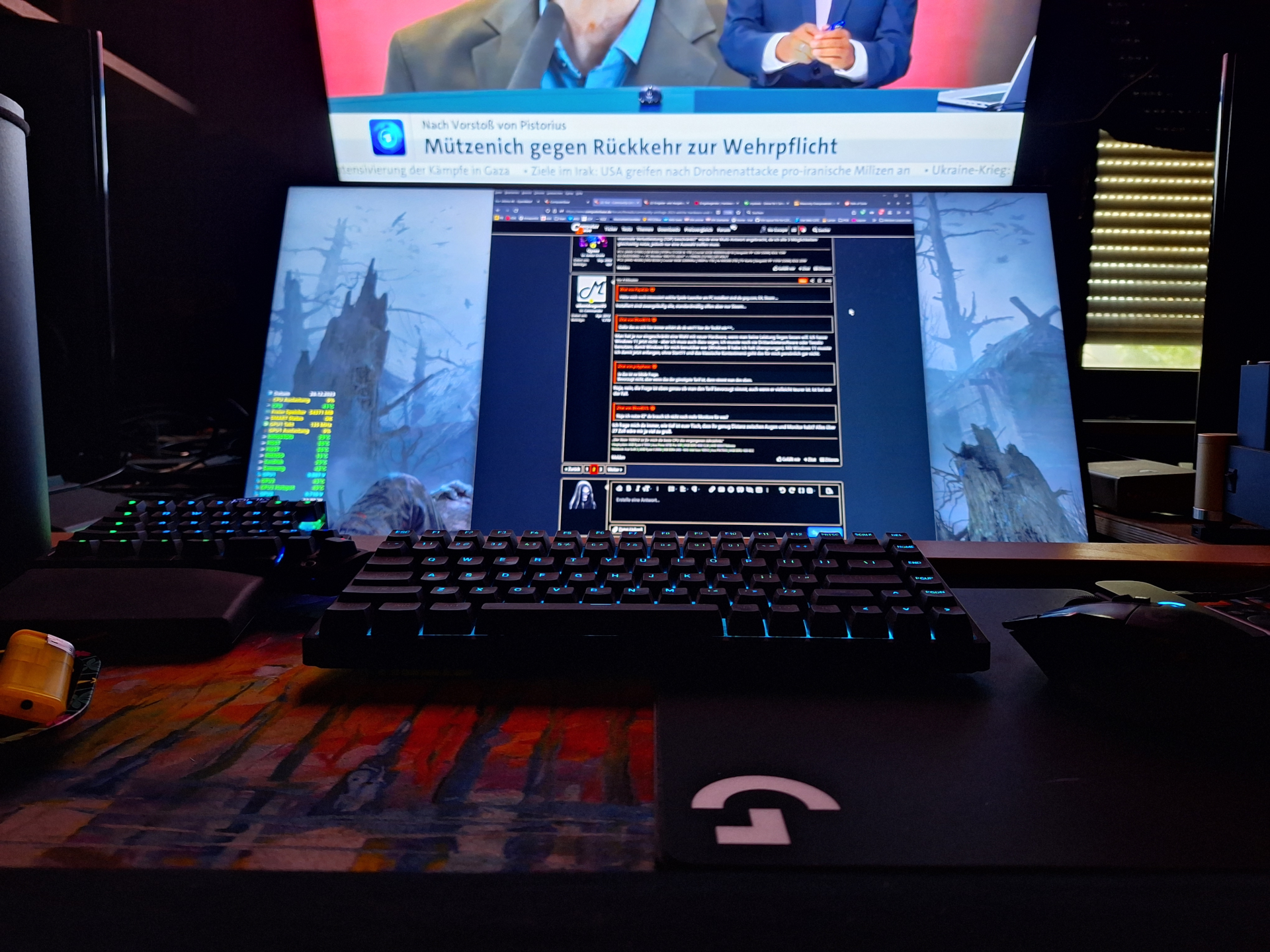 Hatte so ziemlich jede mögliche Konfiguration mit drei Monitoren, übereinander, nebeneinander, 49" usw., aber diese Lösung gefällt mir bisher am besten.