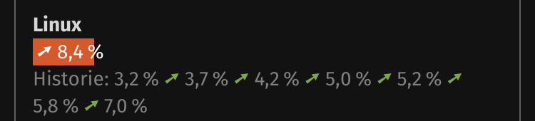 Dachte ich mir auch. Die Trajektorie ist auf den ersten Blick schon unerwartet steil, die Einstiegshürde ist ja durchaus vorhanden. Linux mit KDE ist aktuell auf dem Stand, den damals Win7 hatte. Clean is f*ck; Reduziert auf das, was man braucht. Kein Nudging, kein Gequengel mit der Cloud, einheitlichere Systemsteuerung. Bis auf Adobe läuft alles. Die Gaming-Performance ist mittlerweile auch gut genug. Hin und wieder gibts mal Bugs...das kennt man bei Windows allerdings auch. Komplettes Systemupgrade incl. installierter Software und Reboot in max. 60s? Arch machts möglich.iPat1337 schrieb:Anhang anzeigen 1561356
