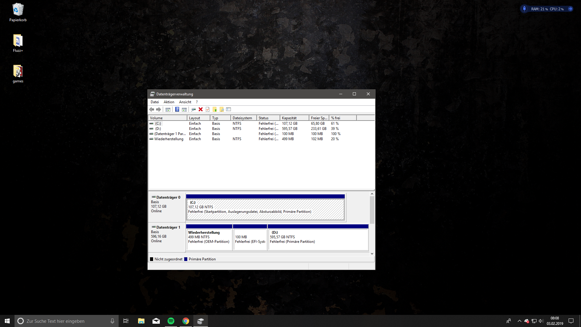 Die Spalte Status wurde nicht weit genug aufgezogen, aber man erkennt ja auch so, dass der Bootloader auf Datenträger 1 liegt, Windows aber auf Datenträger 0. Damit dies nicht passiert, sollte man vor der Installation von Windows immer alle anderen HDDs und SSDs abklemmen.