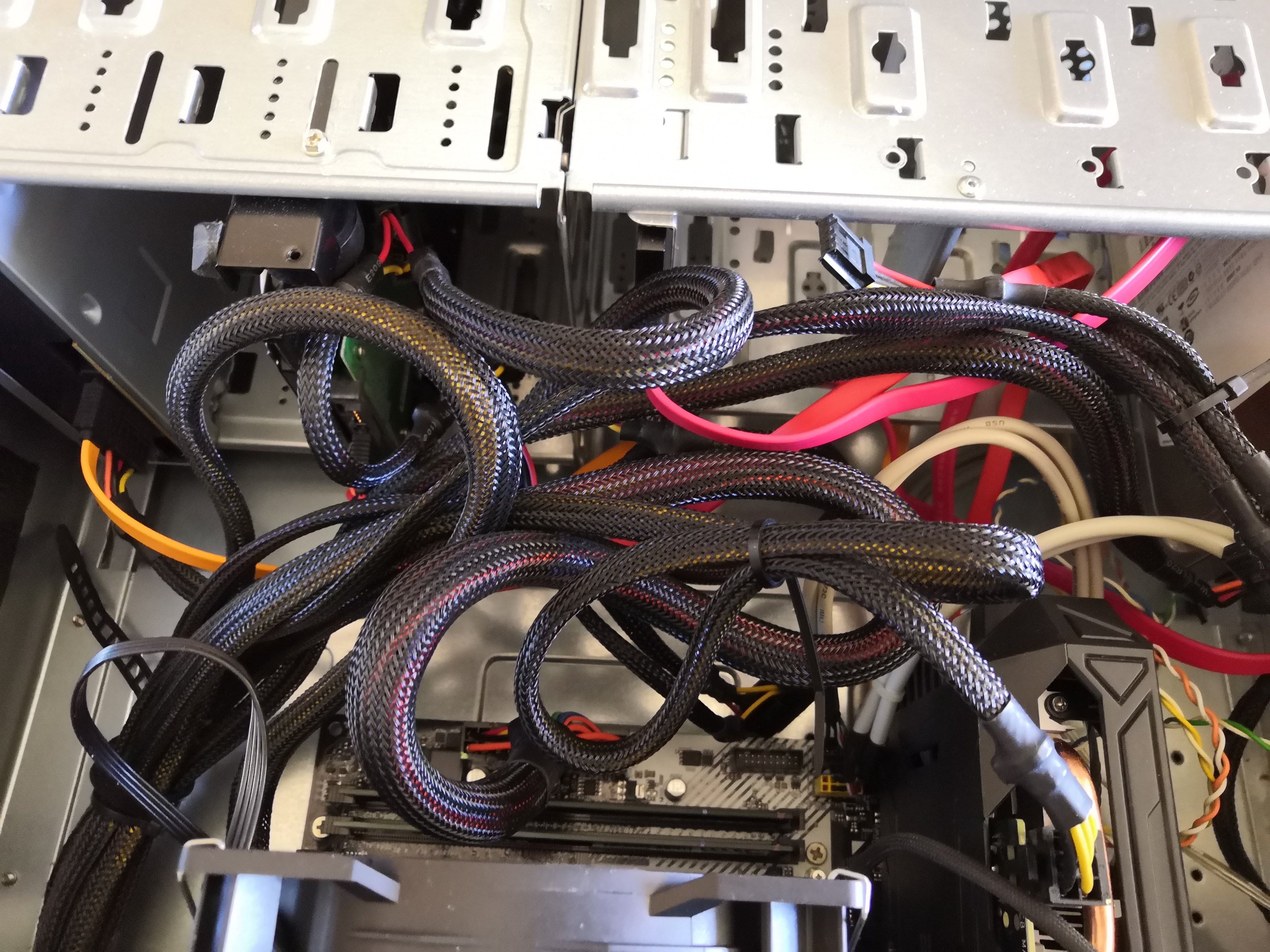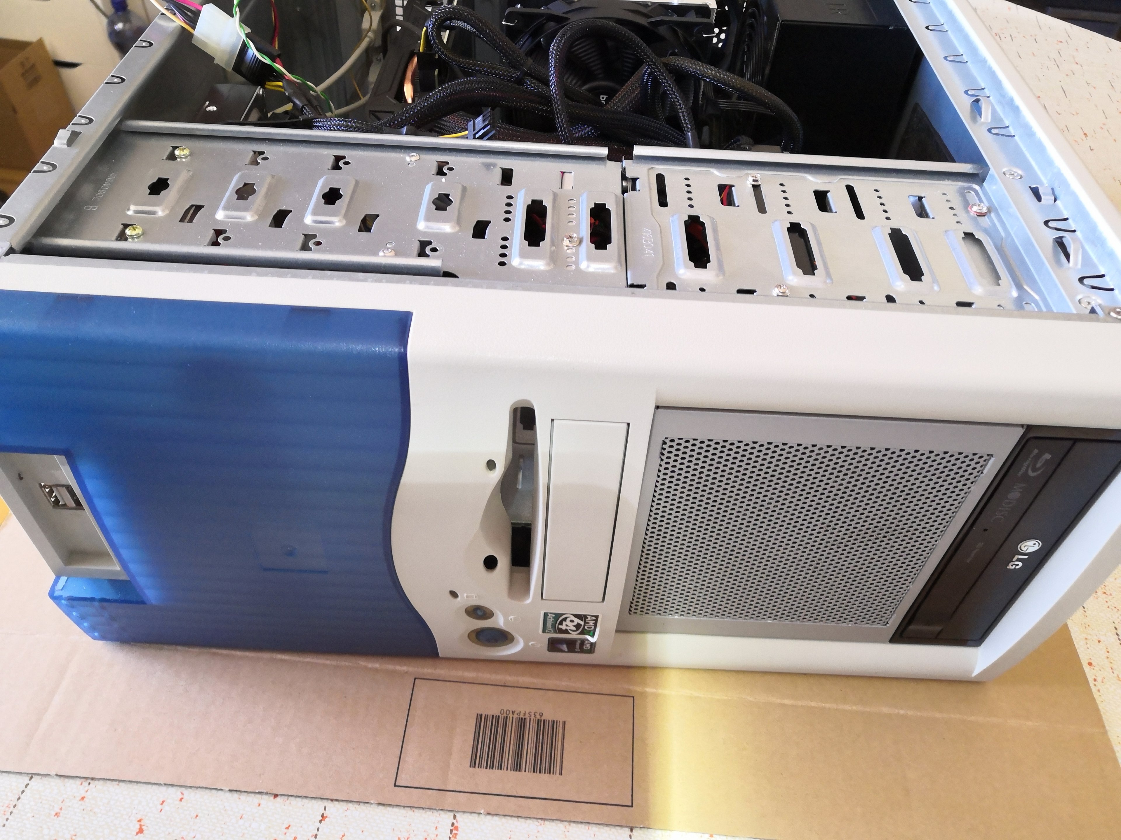 Ich hatte ein altes AMD AM3 System, mit einem Phenom X6. Das Gehäuse ist wirklich alt (Netzteil ist also auch oben...). Die Idee war, den Rechner zu modernisieren und das Gehäuse und das Netzteil zu behalten. Ich hätte mir auch ein neues Gehäuse holen können, aber das alte ist sehr solide (schwer) gebaut und ich hatte es mal vor Jahren etwas gedämmt. Zudem passt der 5,25 Zoll Bluray Brenner ja in die meisten neuen Gehäuse nicht rein. Klar, das alte Gehäuse unterstützt z.B. kein USB 3, schon klar. Kabel-Management wird auch gar nicht unterstützt. Entsprechend chaotisch sieht es im Inneren des Rechners aus, da das Netzteil auch nicht modular ist.