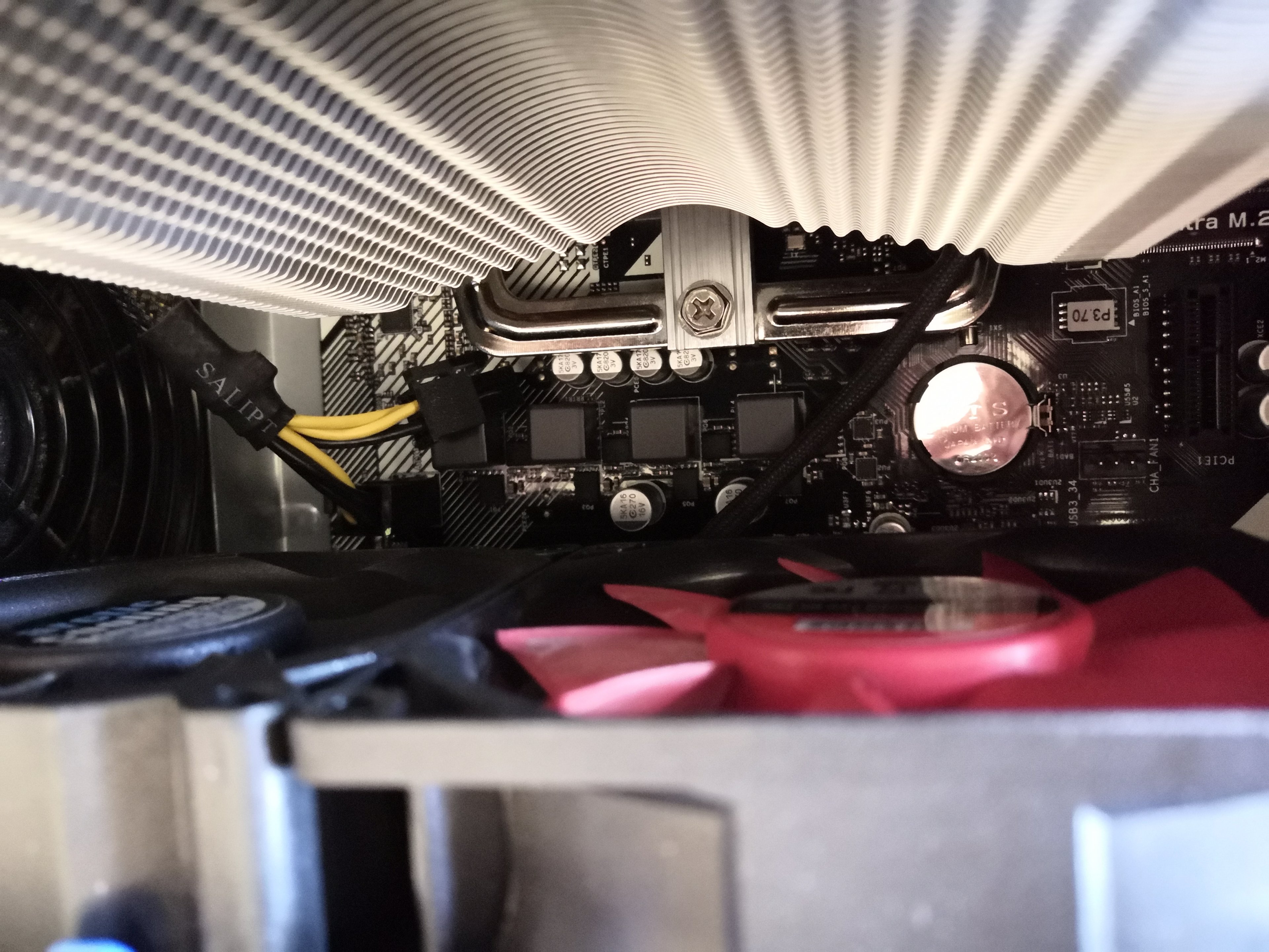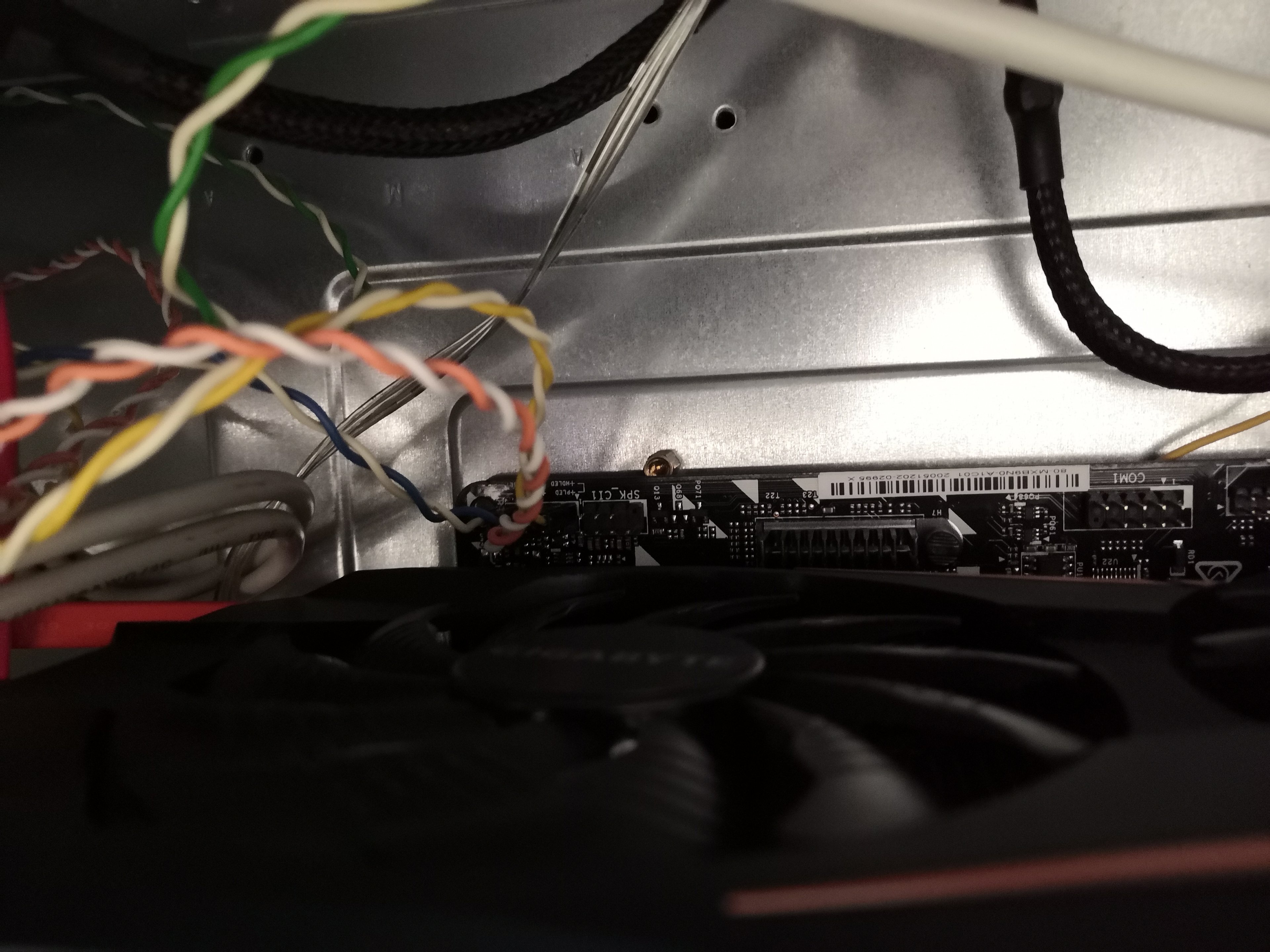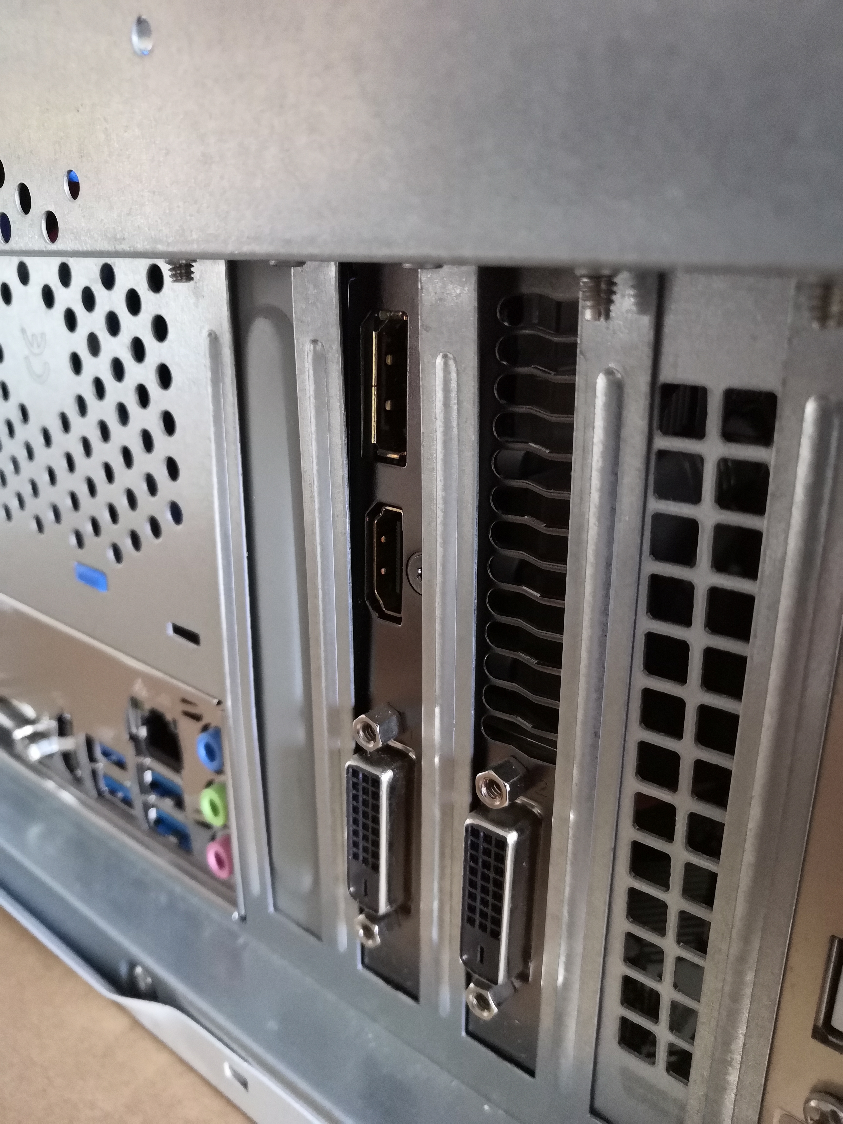 Beim Einbau der neuen Platine hatte ich das Problem, dass das Slotblech der Grafikkarte von der Stelle, wo man sie am Gehäuse anschrauben musste, etwas weit weg war (ca. 2 mm). Ich musste die Grafikkarte also etwas unter Spannung reinschrauben. Ein weiteres Problem ist gewesen, dass der Front-Panel Stecker der Power-LED nicht auf die vorgesehenen Pins vom Mainboard passen. Das habe ich also weggelassen.
