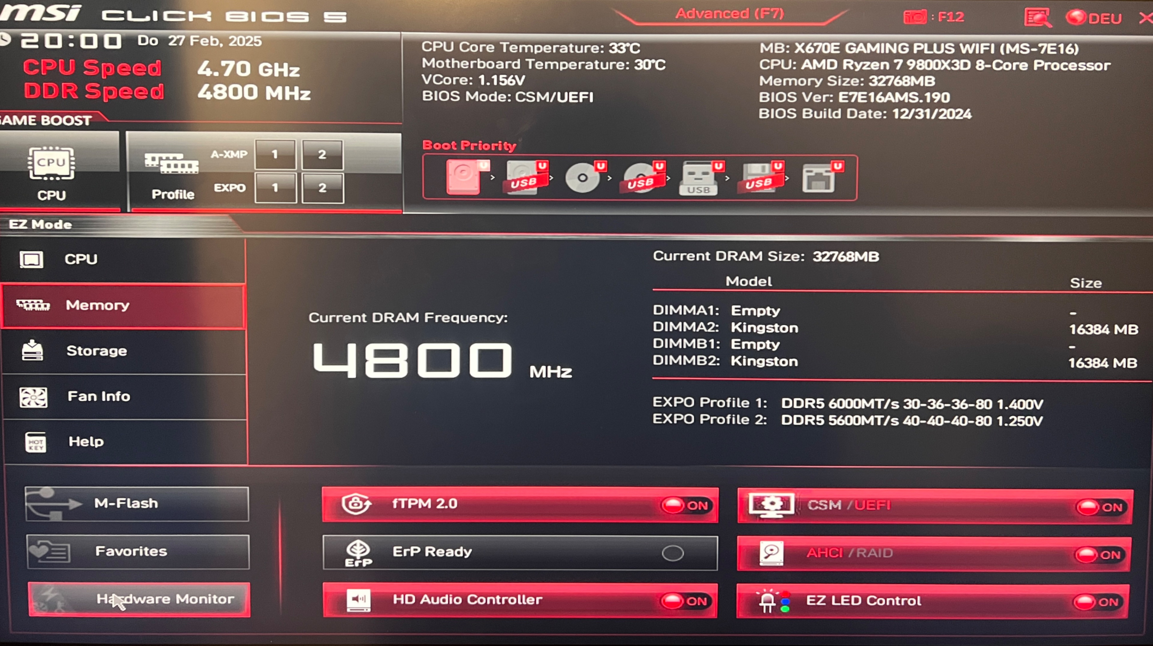 - Arbeitsspeicher (RAM): Kingston 2x16GB DDR5 6.000MT/s (warum hat die zweite hier nur 5.600MT/s und schlechtere Latenzen?)