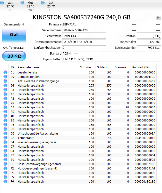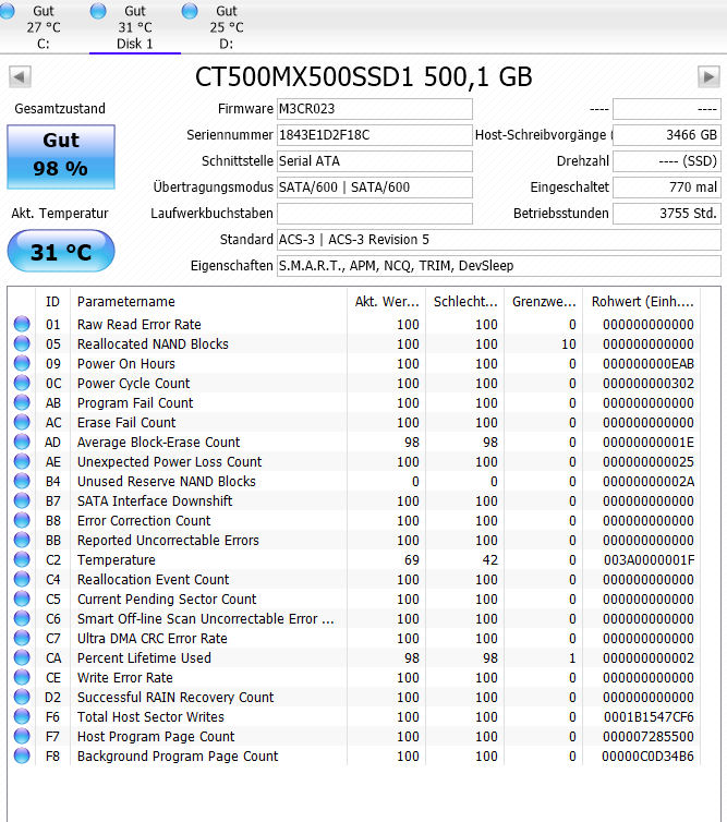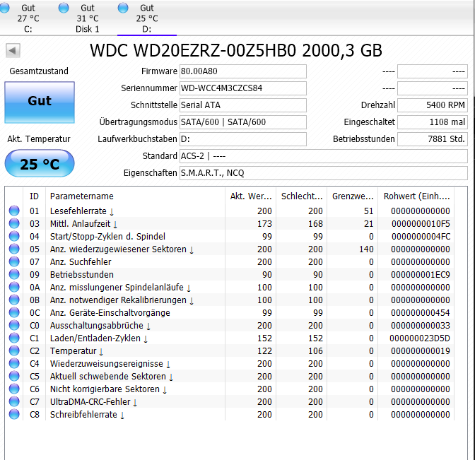 Im Anhang sind die SMART-Werte meiner Festplatten