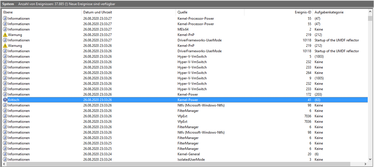 mein ca. 5 Jahre alter Computer hat heute angefangen, ab und zu ohne Vorwarnung auszugehen und sofort wieder zu starten, es kommt kein "Neu starten" und kein Bluescreen, er geht einfach aus und fährt wieder hoch. Ich hatte den Computer heute ca. 7-8h in Betrieb, und er hat sich 3mal neu gestartet.