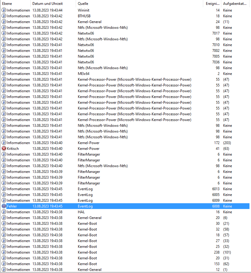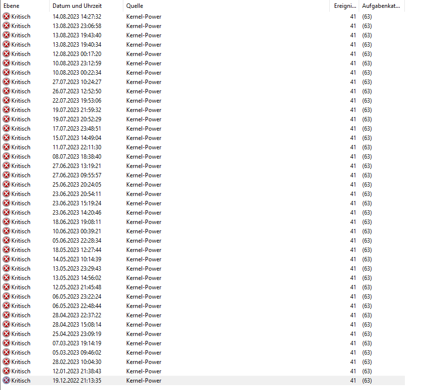 Um einen Crash herum befinden sich ca. 30-40 Ereignisse, wovon die meisten als "Information" gekennzeichnet sind. Außerdem noch ein "Fehler" (Das System wurde zuvor am 13.08.2023 um 19:40:40 unerwartet heruntergefahren.; Ereignis-ID: 6008) und einmal "Kritisch" (Das System wurde neu gestartet, ohne dass es zuvor ordnungsgemäß heruntergefahren wurde. Dieser Fehler kann auftreten, wenn das System nicht mehr reagiert hat oder abgestürzt ist oder die Stromzufuhr unerwartet unterbrochen wurde.; Ereignis-ID 41). Im Anhang befindet sich noch ein Bild von dem Eventlog um einen solchen Crash herum.