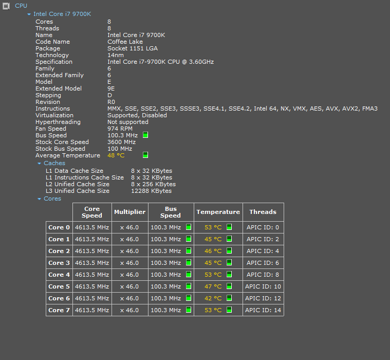 - Prozessor (CPU): Intel Core i7 9700K CPU @ 3.60GHz | Cores: 8 | Threads: 8 | Coffee Lake | Socket 1151 LGA | ~45 °C
