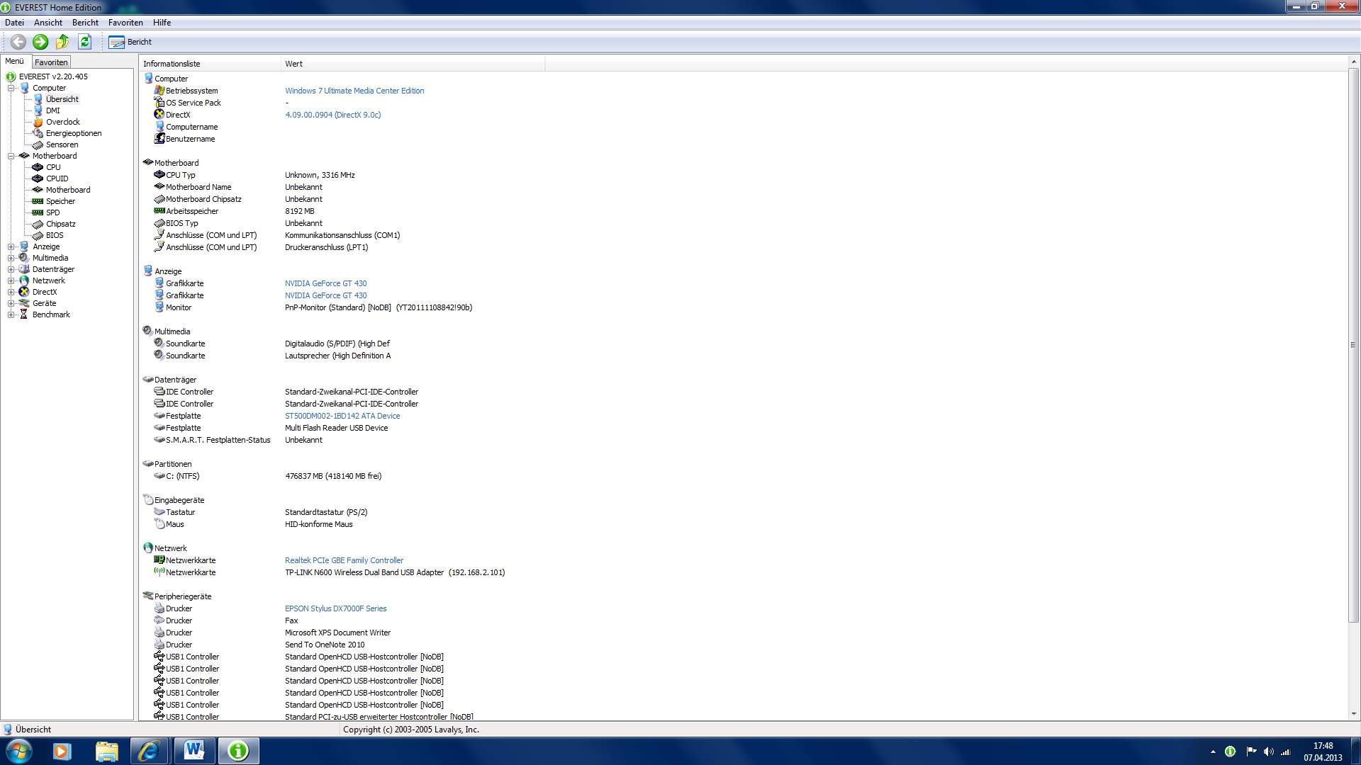 Hmm, also die CPU wird zwar nicht angezeigt, aber anhand der Taktrate vermute ich jetzt einfach mal, dass es sich um einen FX6100 handelt. Oder ist das Ding übertaktet und ich liege falsch? MB ist ein Asus mit nicht mehr ganz frischem 760G-Chipsatz und Graka ist eine GT430.