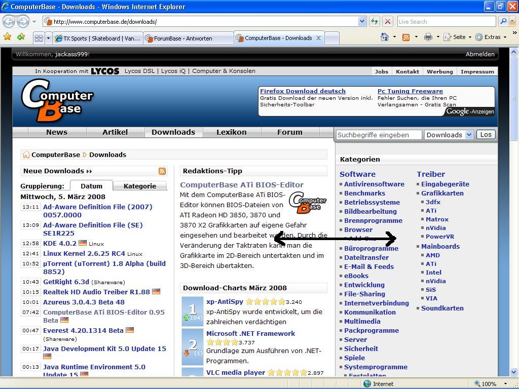 Und auf der Download-Startseite gab es auf CB3 in der linken Hauptspalte Download-Tipp + Kategorien, in der rechten Hauptspalte die neuesten Downloads als Liste und im Seitenstreifen die Download-Klassiker (also nicht so wie von dir eingezeichnet). Die Kategorien werden auf CB4 jedenfalls definitiv im Seitenstreifen bleiben, denn so ist es einheitlich über die News-, Artikel-, Downloads- und Lexikon-Sektion so.