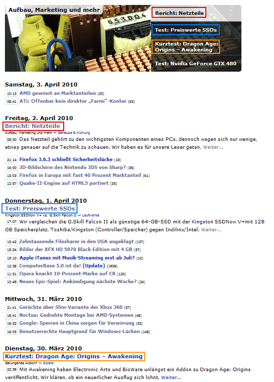 Artikel werden immer mit Einleitung ausgegeben und sind mit einem Präfix wie z.B. "Test:" oder "Bericht:" versehen.sizeofanocean schrieb:Aber es geht total unter, ob es sich nun wirklich nur um eine News mit ein paar Zeilen Inhalt geht, oder ob sich hinter einem Link ein gigantischer und interessanter Artikel oder Test verbirgt.