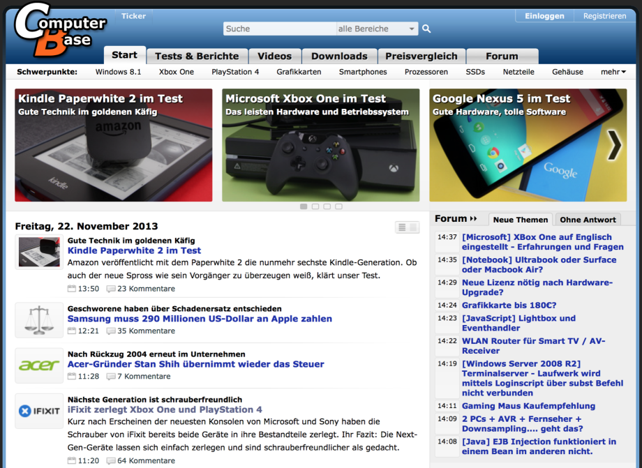 Darunter sieht man bereits 4 Newsbeiträge und zur Rechten die aktuellen Foreneinträge. Die Gliederung mag zwar keinem Modetrend entsprechen, ist aber klar, übersichtlich und erfüllt ihren Zweck auf den ersten Blick - ohne auch nur einen einzigen Klick oder eine einzelne Bewegung auszuführen. In der aktuellen Variante gibt sich lediglich noch ein einziger Beitrag zu erkennen. Der Forenticker ist weiter unten zu finden. Nochmal zur Werbung: Die ist momentan sehr bunt - mal tiefes Rot, mal giftiges Grün. Das Orange in den Überschriften wirkt auch sehr knallig und diese Kombination verwirrt mich. Eventuell würde ein einfaches Schwarz mehr Kontrast zu der nun allgegenwärtigen Werbung schaffen.