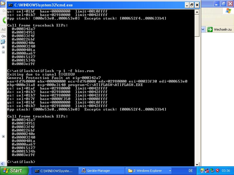 winflash reagiert nicht, aber atiflash funktioniert auf der comando zeile, leider mit dem gleichen fehler wie unter dos. hier ein screenshot.