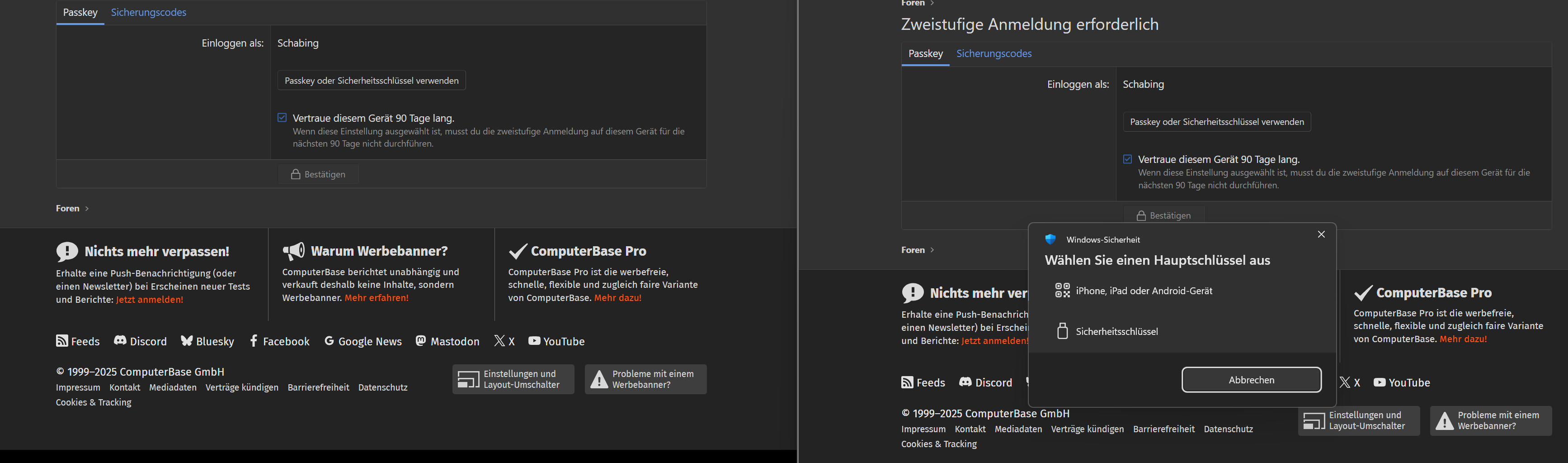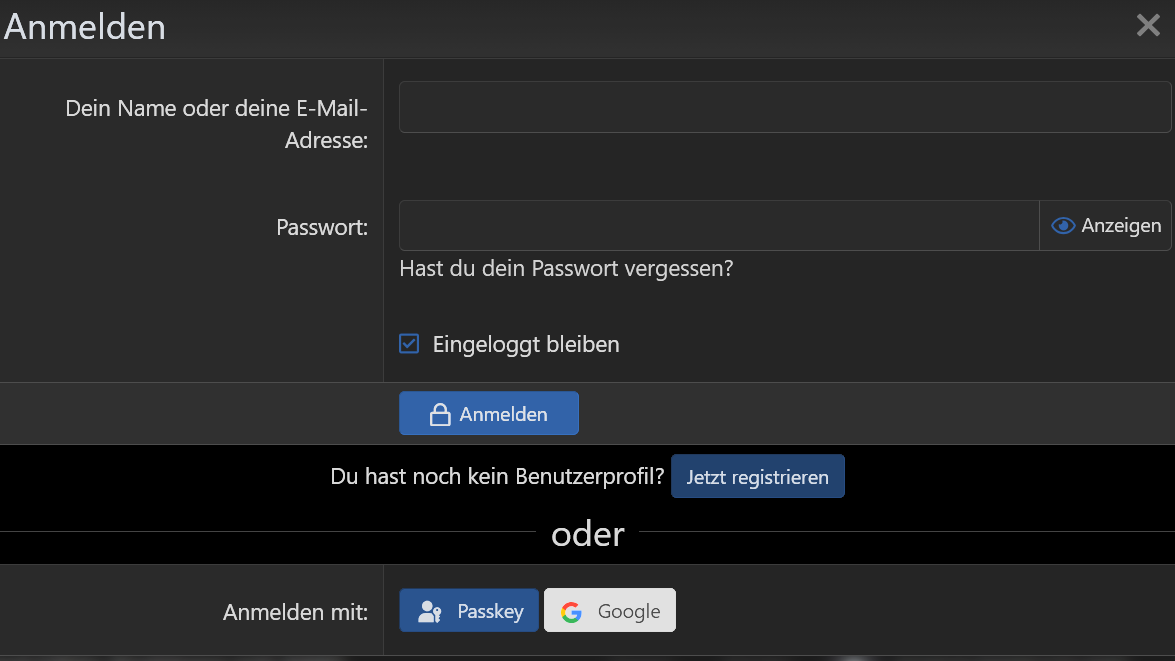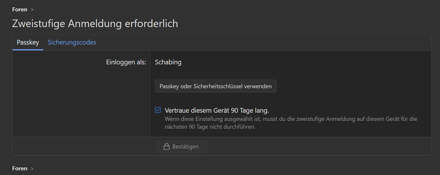 das Forum verlangt jetzt (sehe ich positiv) einen zweiten Faktor. Allerdings kann ich mich mit Firefox nicht anmelden, es wird mir kein Passkey Feld angeboten. Da mir solche Probleme bewusst sind, deswegen habe ich auch jahrelang an Chrome festgehalten, habe ich den Chrome probiert. Da ging das sofort. Screenshot anbei.