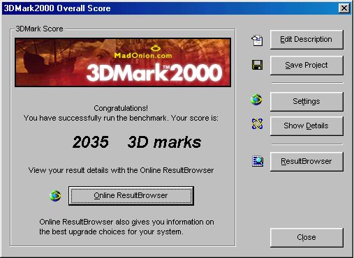 3DMark 2001 SE bricht nach dem ersten Test aufgrund von zu wenig Bildspeicher ab. Daher wurde 3DMark 2000 verwendet.