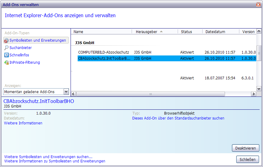 Beim Internet Explorer installiert die Software eine neue Symbolleiste mit dem Namen: